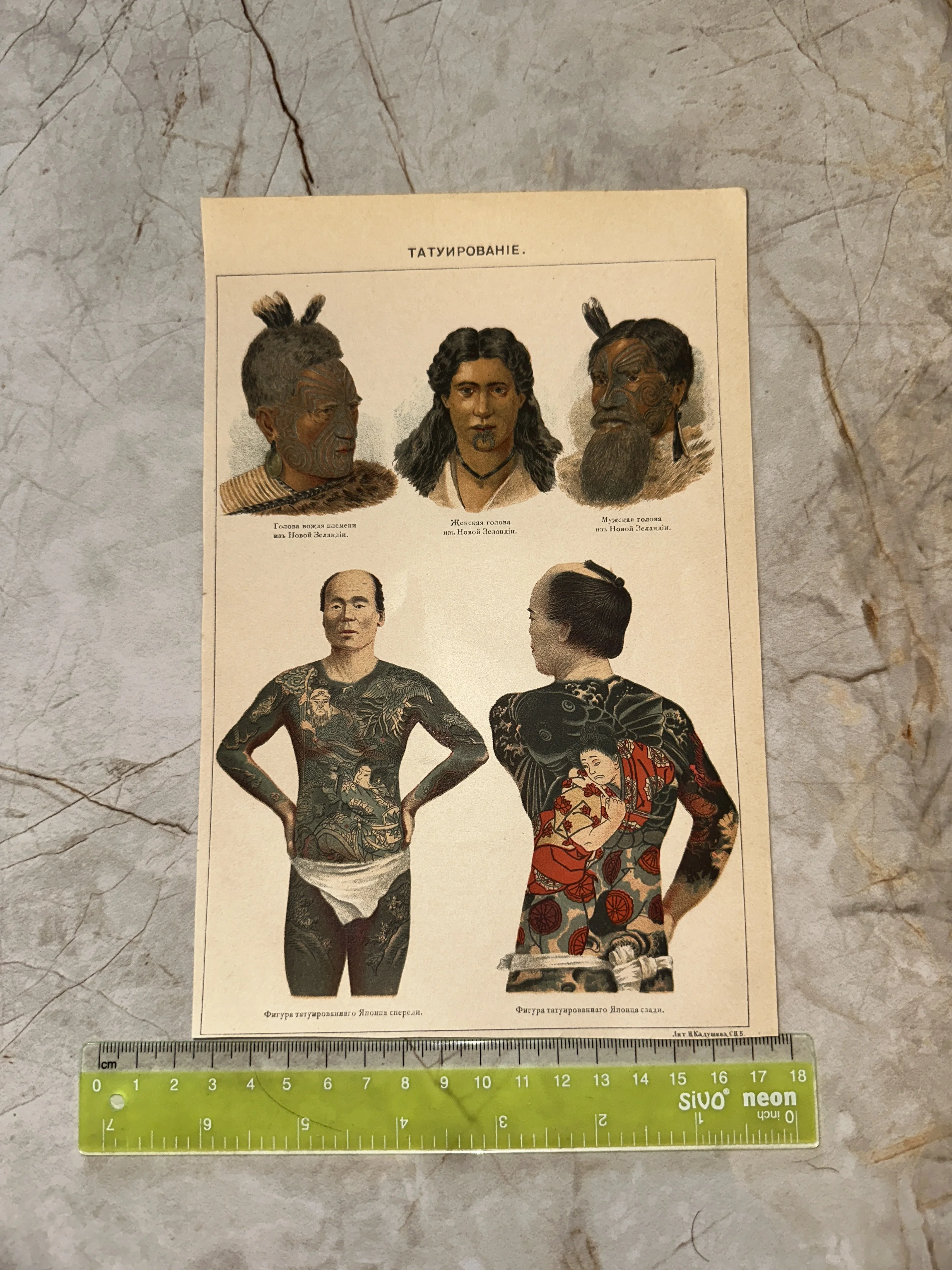 Редкий этнографический лист конца XIX века, изданный в литографии И. Кадушина в Санкт-Петербурге, наглядно демонстрирует искусство татуировки народов Новой Зеландии и Японии. Четкие линии и насыщенные цвета позволяют детально рассмотреть как сакральные узоры маори, так и сложнейшие сюжеты японского ирэдзуми. Лист обладает высокой коллекционной ценностью и станет прекрасным дополнением интерьера или тематического собрания, посвященного истории культуры и этнографии.