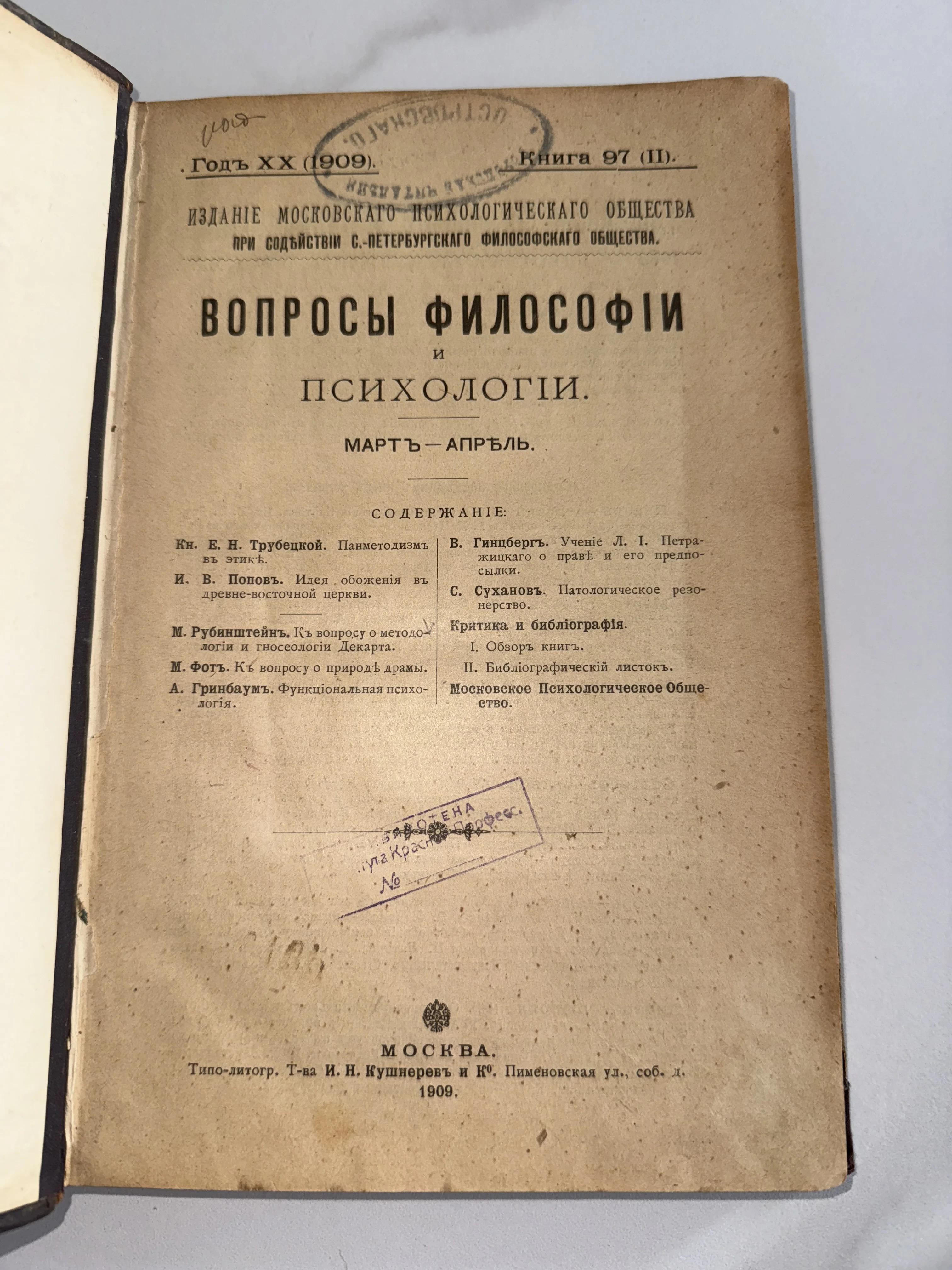 Титульный лист антикварного журнала 'Вопросы философии и психологии' за март-апрель 1909 года с перечнем статей и архивными печатями.