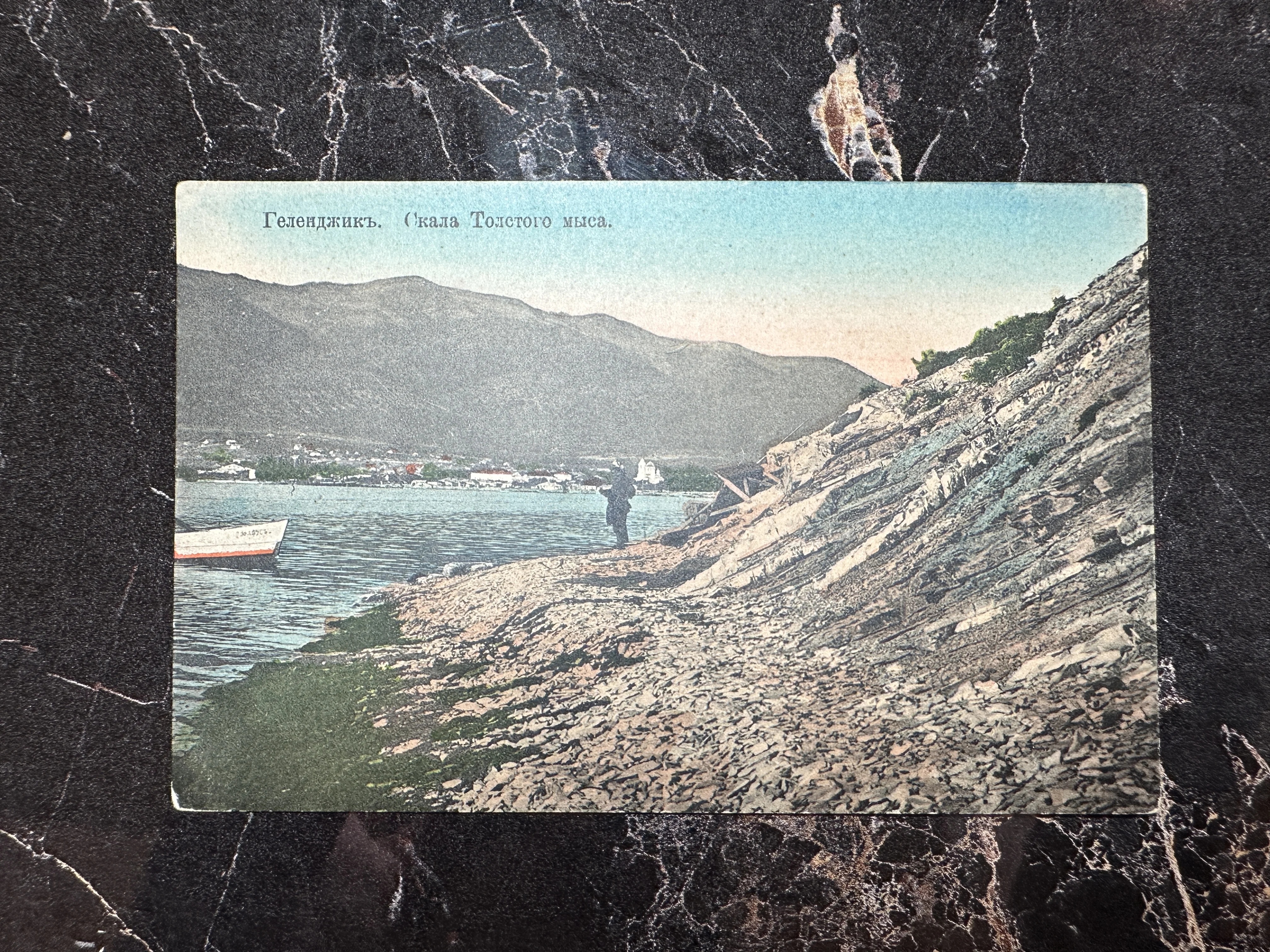 Старинная раскрашенная открытка с видом на скалистый берег Толстого мыса в Геленджике, лодкой и горами на заднем плане.