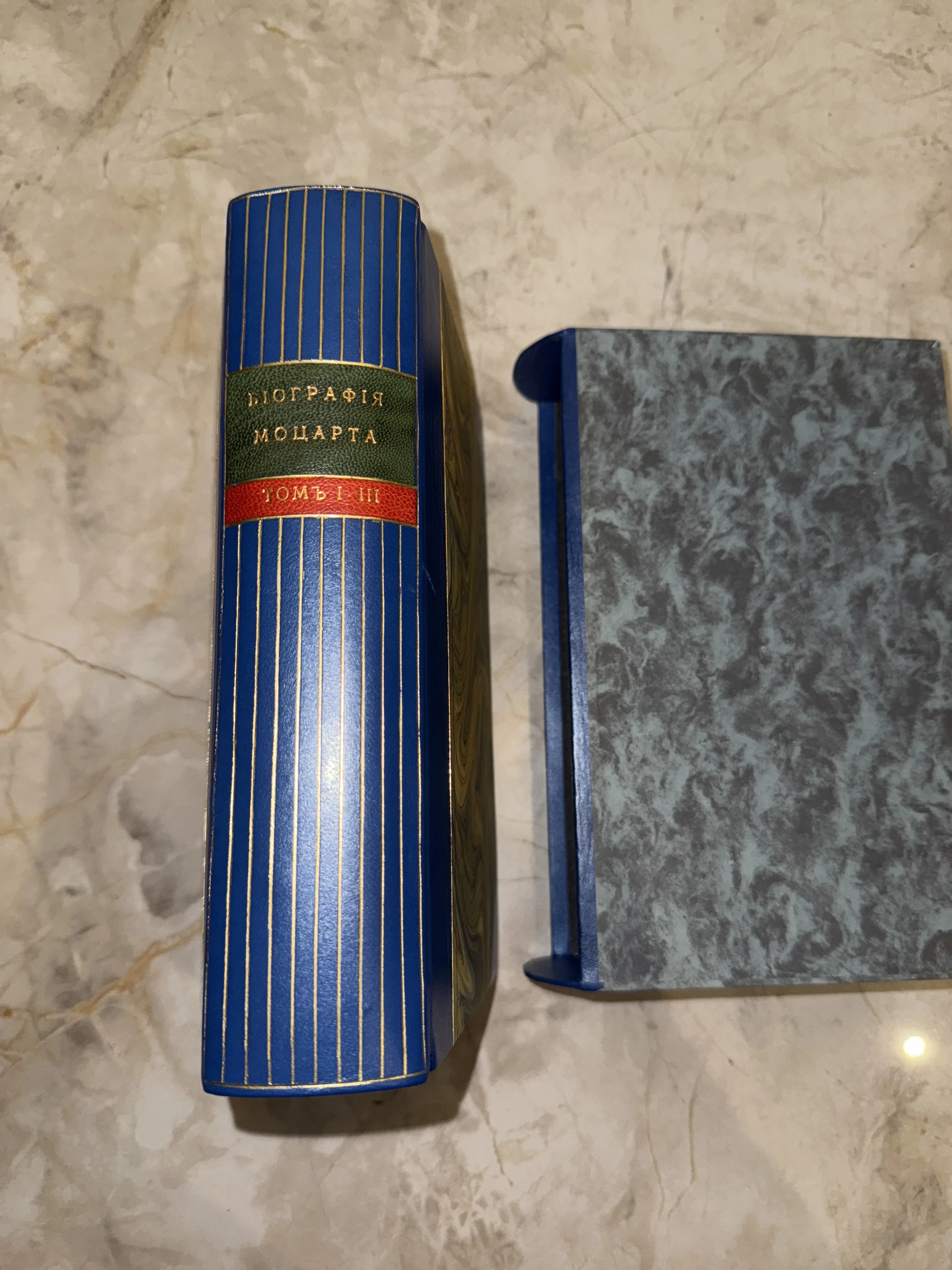 Изысканный синий переплет с золотым линейным тиснением дополнен контрастными кожаными наклейками с тиснением названия и номеров томов. Книга укомплектована защитным футляром с мраморным узором, что свидетельствует о бережном хранении и подчеркивает коллекционный статус издания. Это монументальное жизнеописание великого композитора станет подлинным украшением частной библиотеки и ценным подарком для меломана.