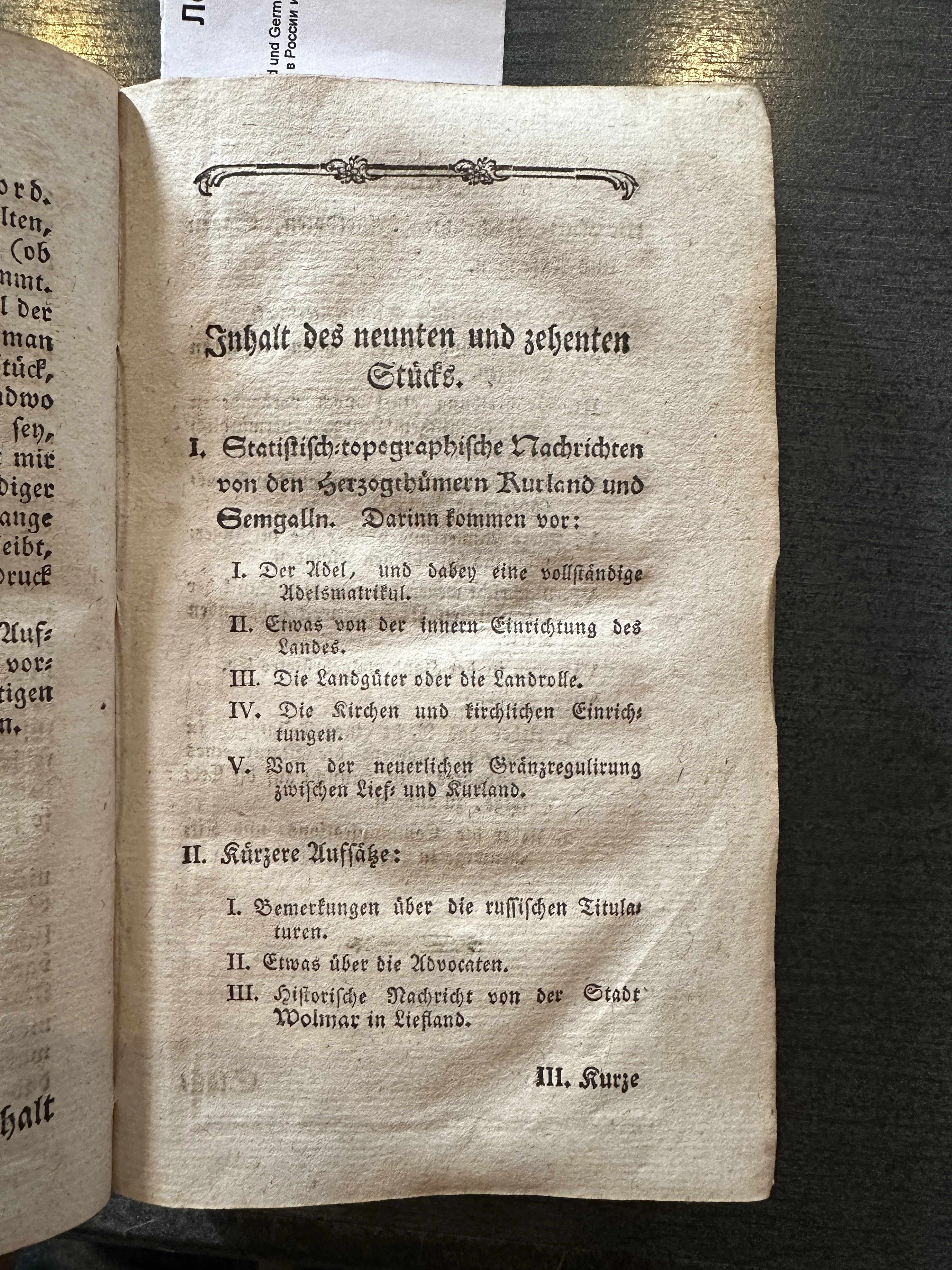 Перед вами подлинная страница из редкого немецкого издания, посвященного топографии и истории Курляндии и Семигалии. Изящная готическая гарнитура и декоративная виньетка подчеркивают почтенный возраст артефакта, а плотная бумага верже сохранила подлинный дух эпохи Просвещения. Этот документ станет ценным дополнением к коллекции редких книг или важным источником для исследователей балтийской истории.