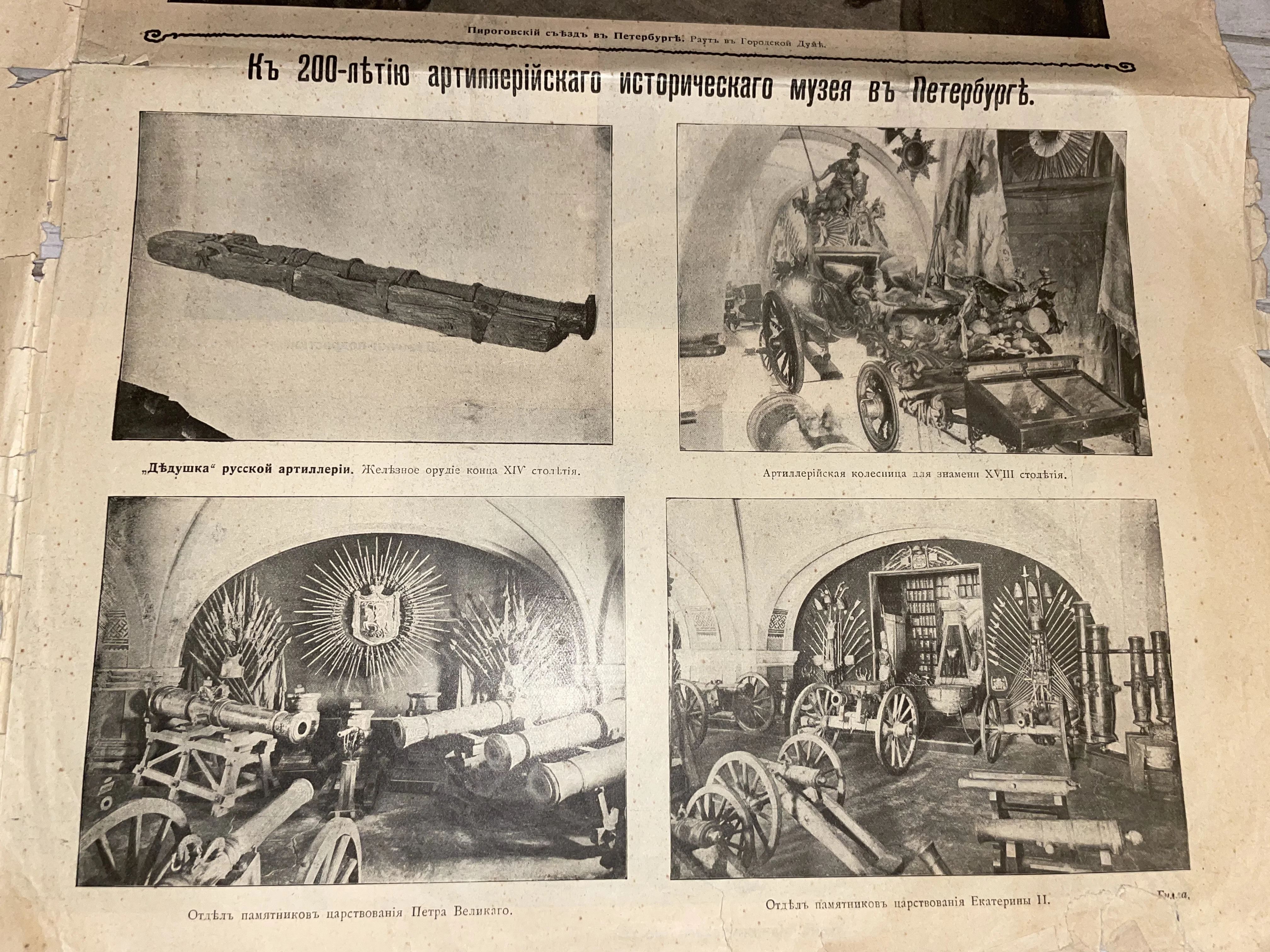 Уникальный фрагмент периодического издания начала XX века, посвященный юбилею одного из старейших музеев России. На иллюстрациях запечатлены редкие артефакты: от примитивных железных орудий XIV века до пышных залов эпохи Петра I и Екатерины II. Благородная патина времени и сохраненная дореволюционная орфография делают этот лист ценным экземпляром для коллекционеров военной истории.
