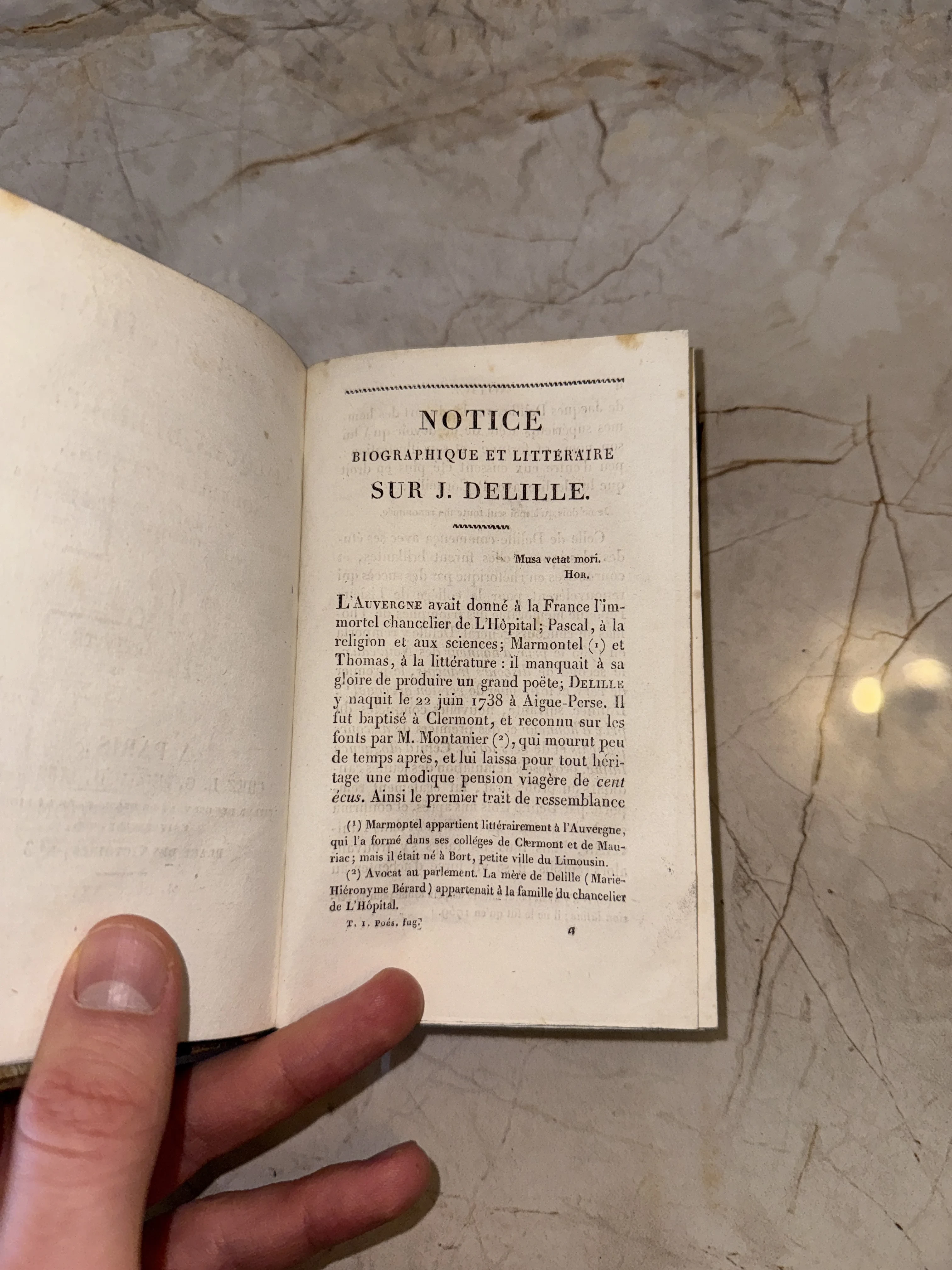 Разворот старинной книги на французском языке с биографическим очерком о Жаке Делиле на фоне мраморной поверхности.