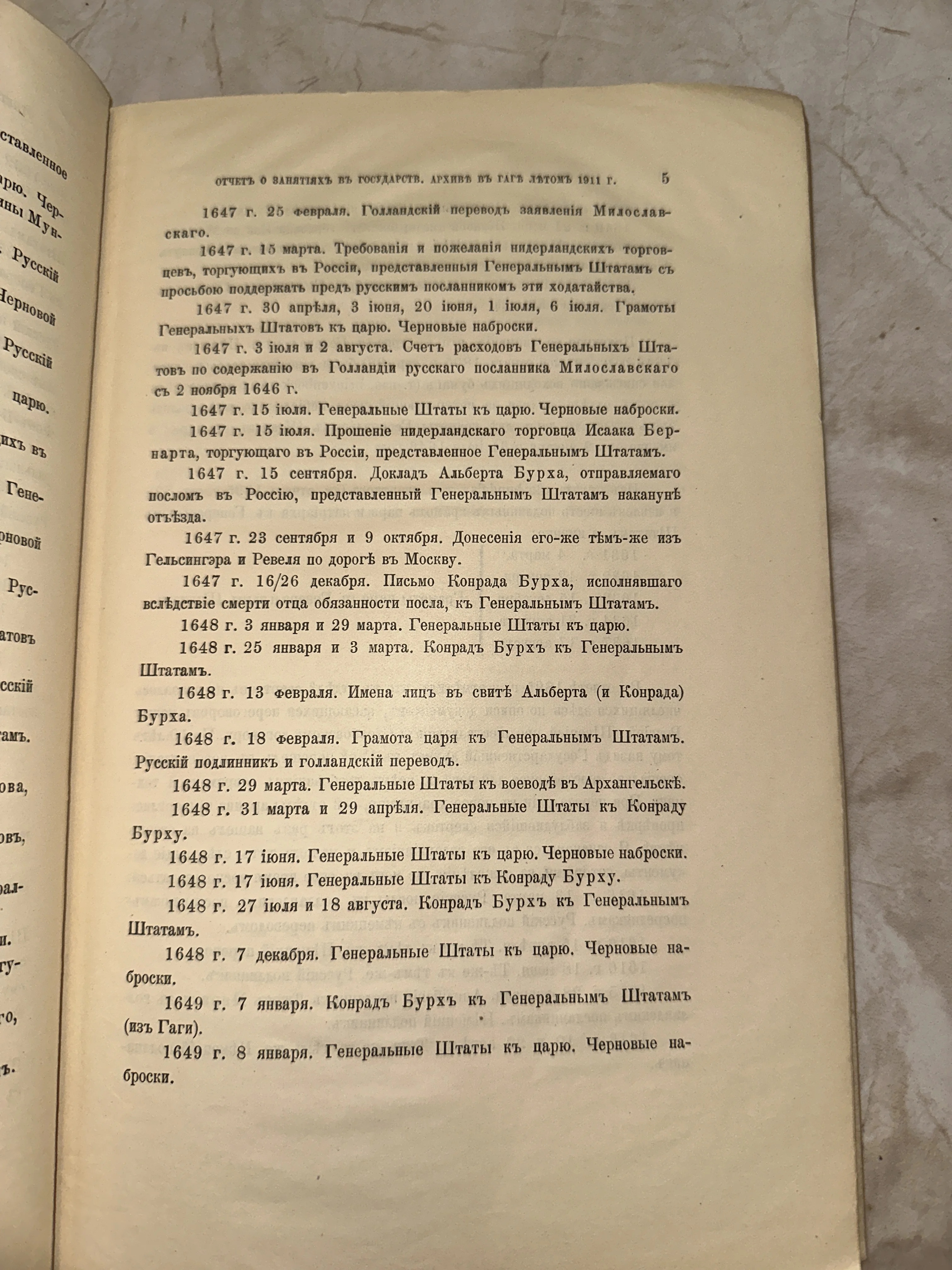 Редкая страница из научного отчета начала XX века, содержащая подробный реестр дипломатических грамот и писем 1647–1649 годов. Благородная патина времени на плотной бумаге и аутентичная дореволюционная орфография делают этот экземпляр ценным артефактом для коллекционеров и исследователей истории дипломатии.