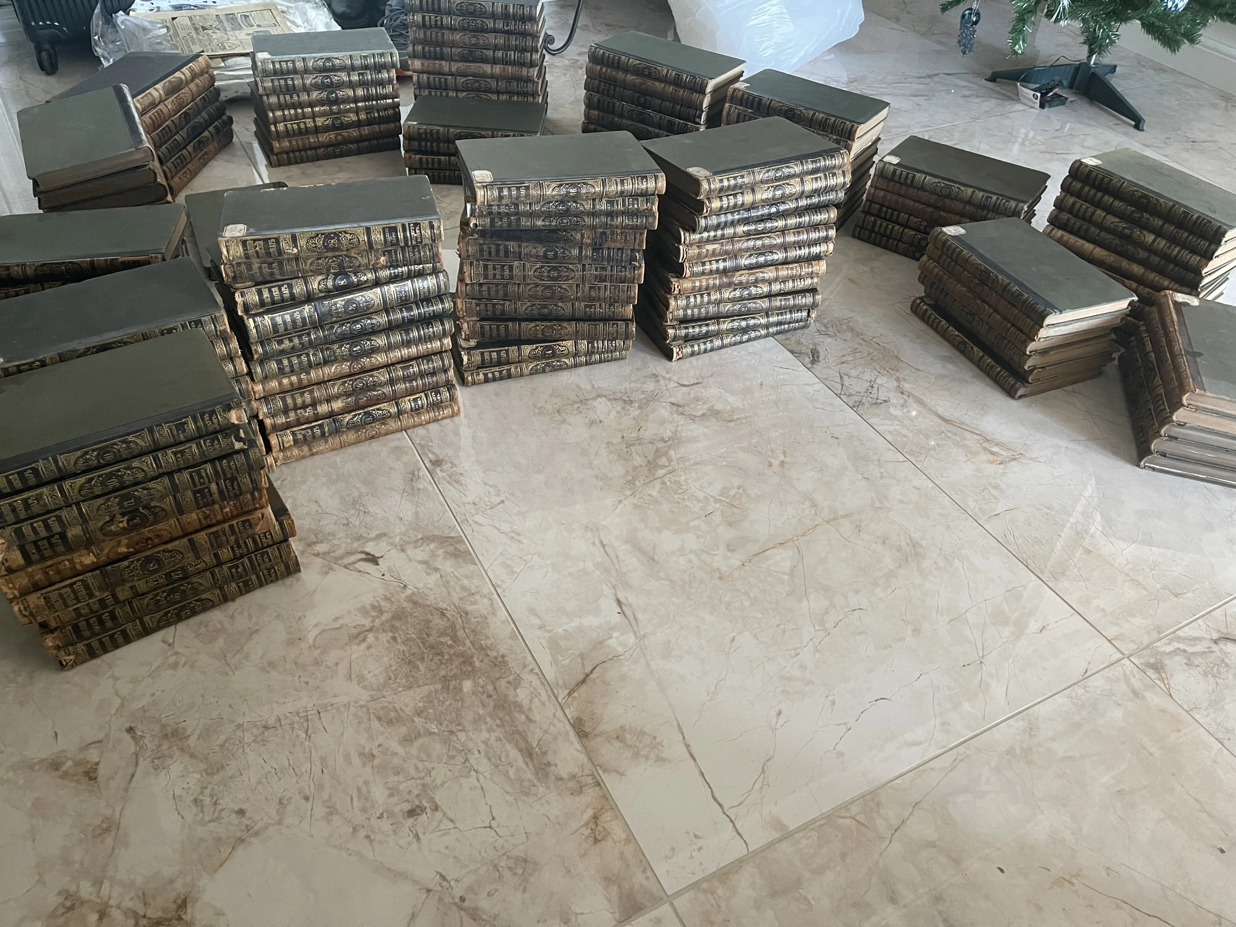 Множественные стопки старинных книг в темных переплетах с золотым тиснением на корешках, лежащие на мраморном полу.
