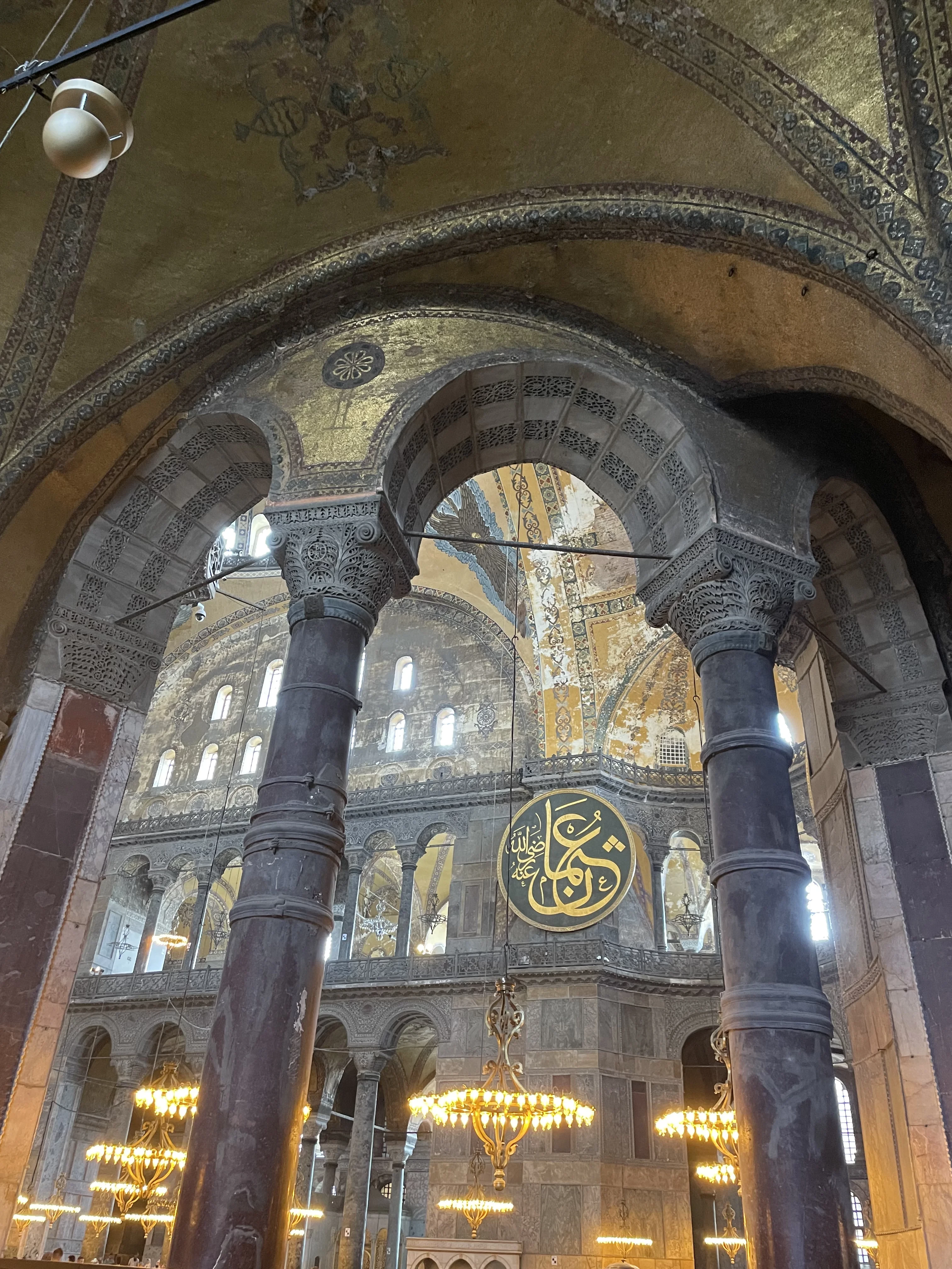 На снимке запечатлена уникальная синергия византийского зодчества и исламского искусства в пространстве Айя-Софии. Массивные порфировые колонны и золотое сияние древних мозаик под сводами создают неповторимую атмосферу вечности и монументальности. Мягкий свет люстр подчеркивает безупречную сохранность архитектурных деталей и глубину исторического наследия этого шедевра.