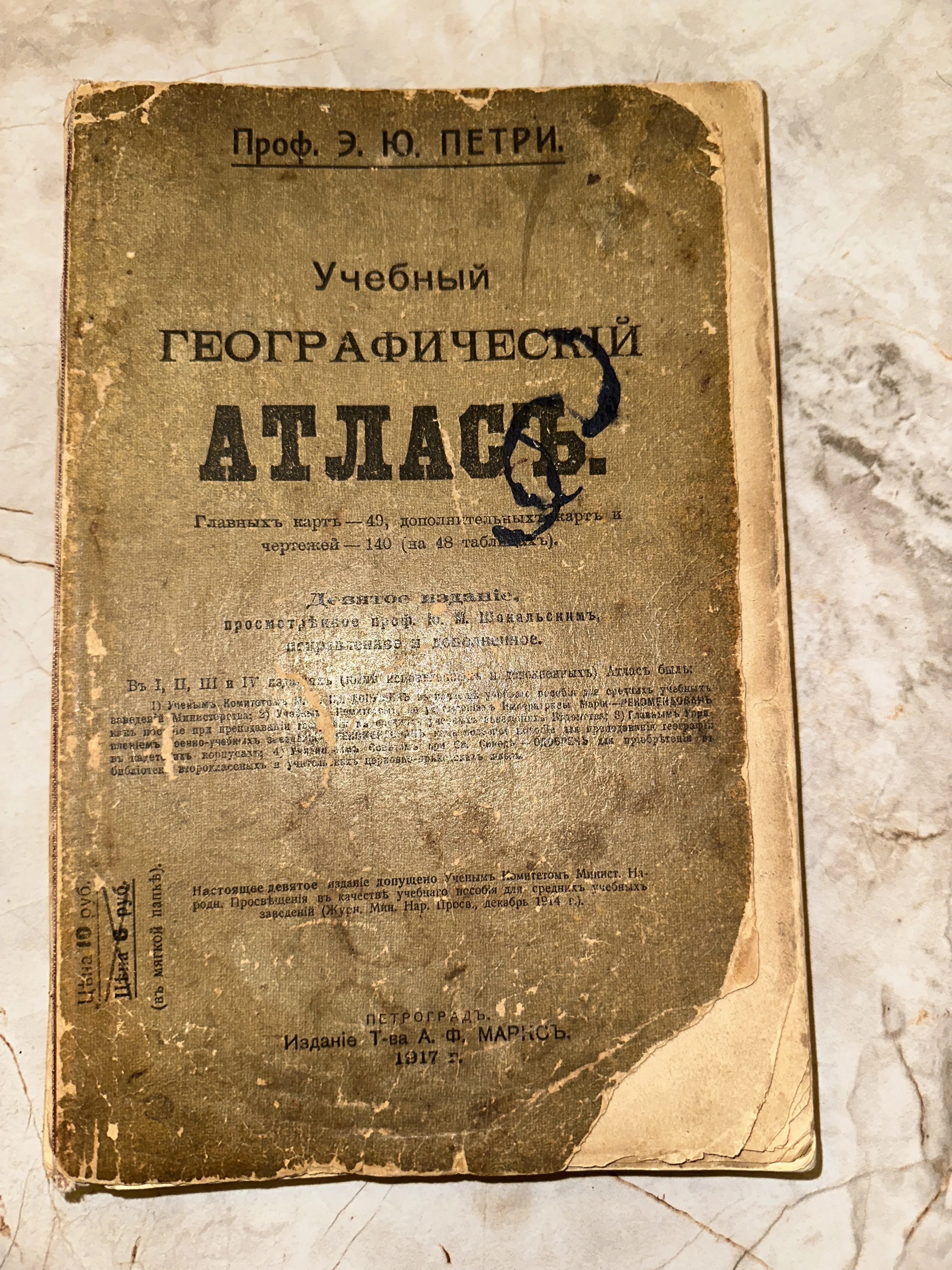 Потертая обложка старинного географического атласа 1917 года, изданного в Петрограде товариществом А. Ф. Маркса.