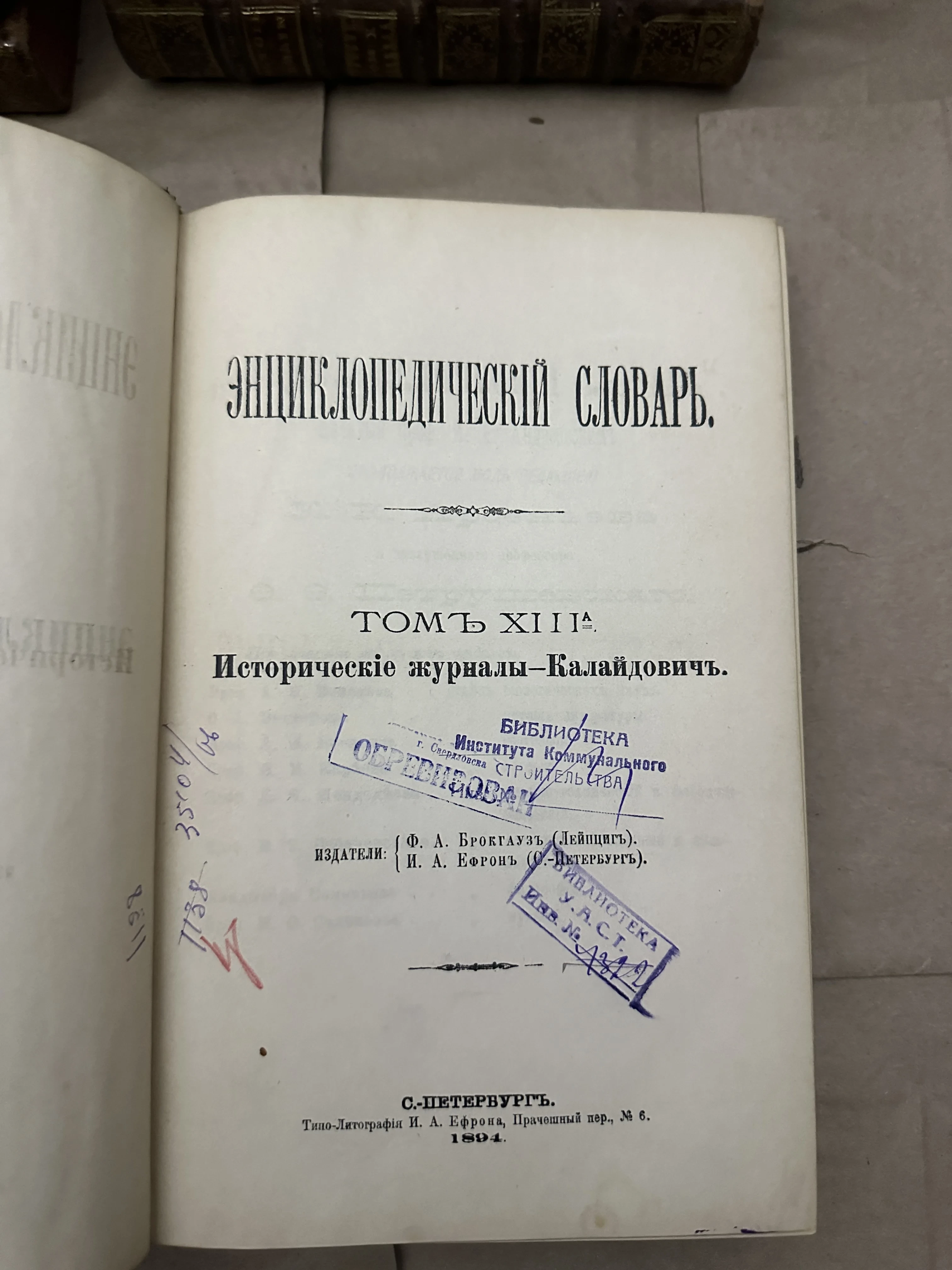 Представляем вашему вниманию подлинный титульный лист знаменитого «Энциклопедического словаря» Брокгауза и Ефрона, напечатанный в конце XIX века. Особый шарм предмету придают аутентичные библиотечные штампы и рукописные пометки, свидетельствующие о долгой истории и научной ценности данного экземпляра.