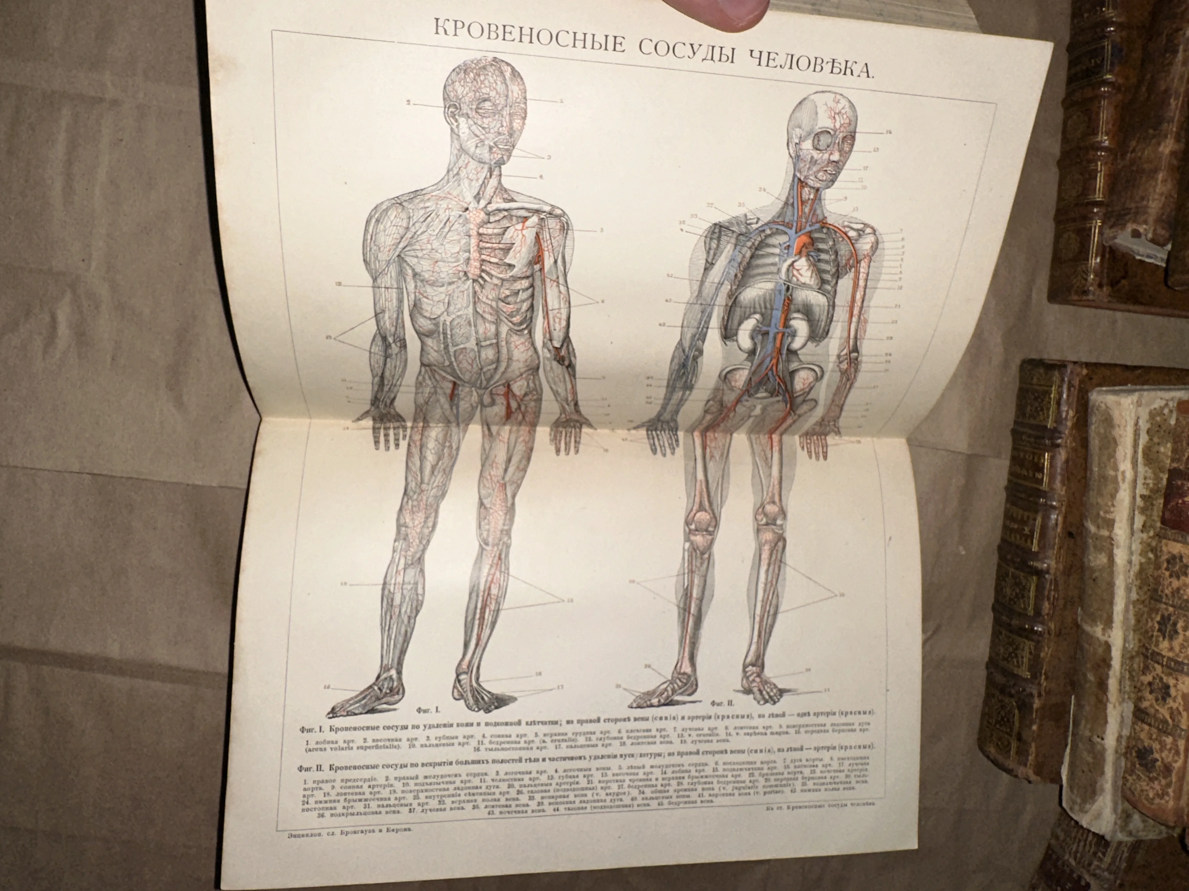 Разворот антикварной книги с цветной гравюрой, изображающей кровеносную систему человека в полный рост с подписями на дореволюционном русском языке.
