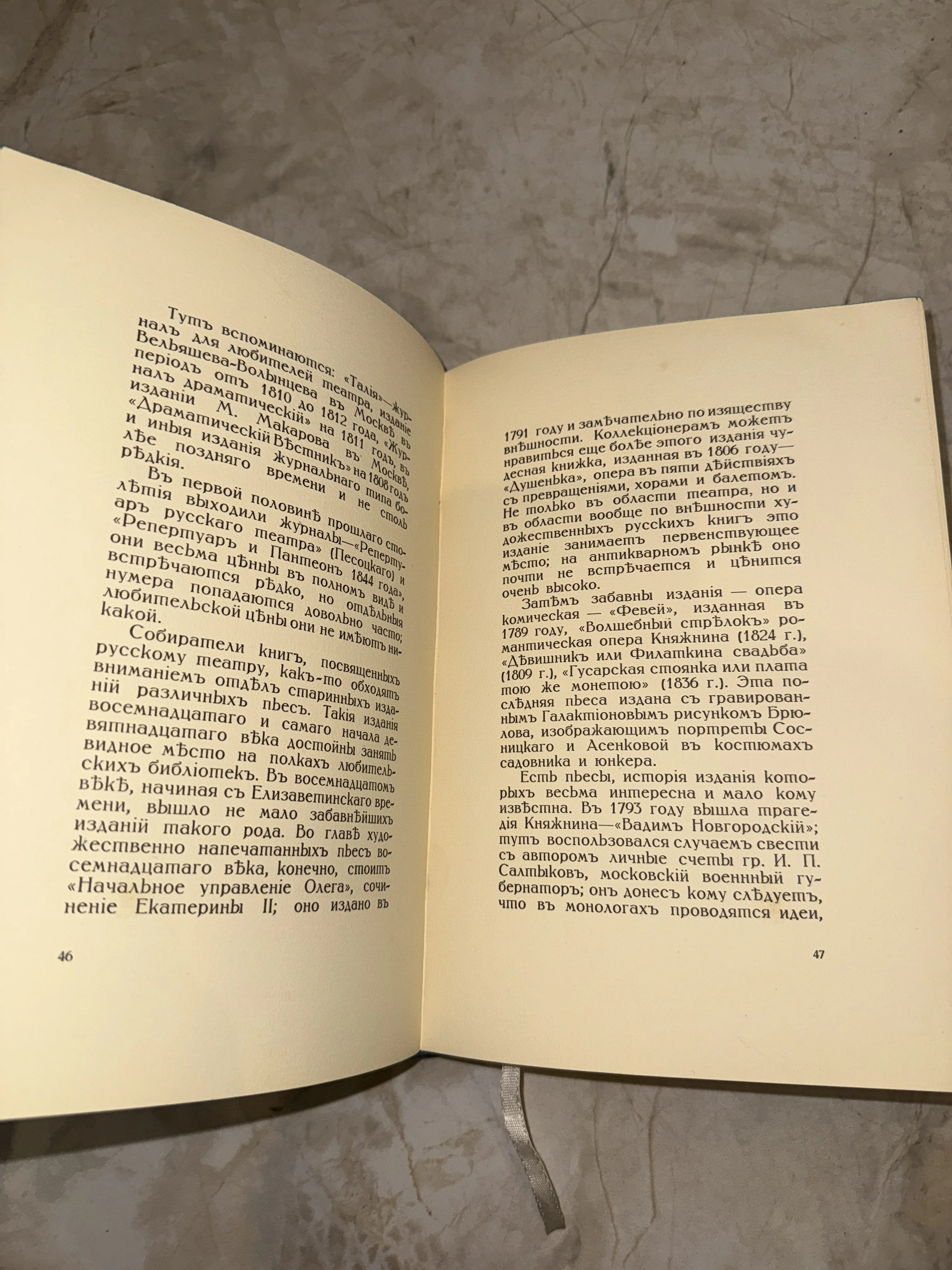 Разворот антикварного библиографического издания о русском театре
