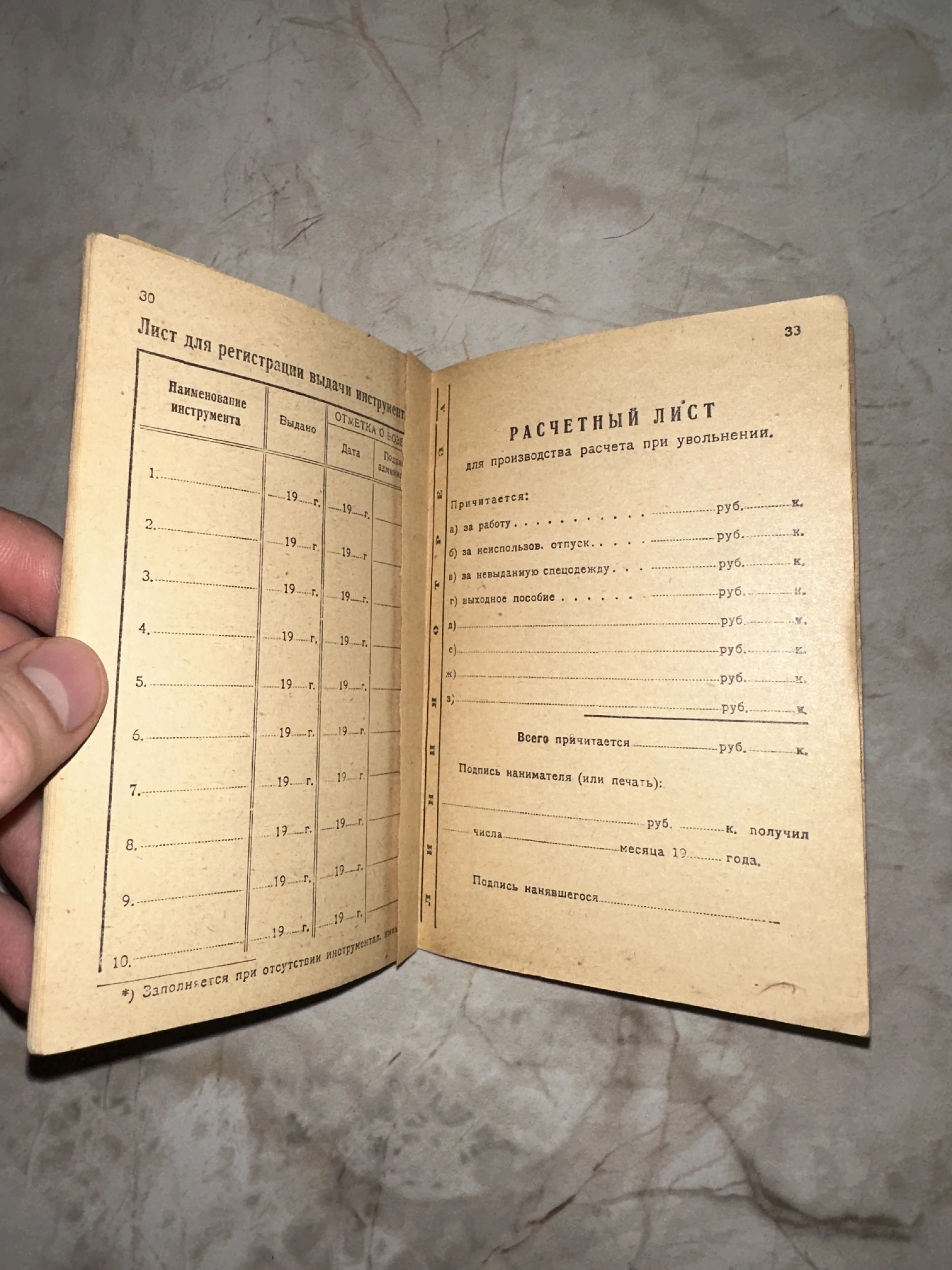 Фотография открытого документа советского периода со страницами для регистрации выдачи инструмента и расчетным листом при увольнении.
