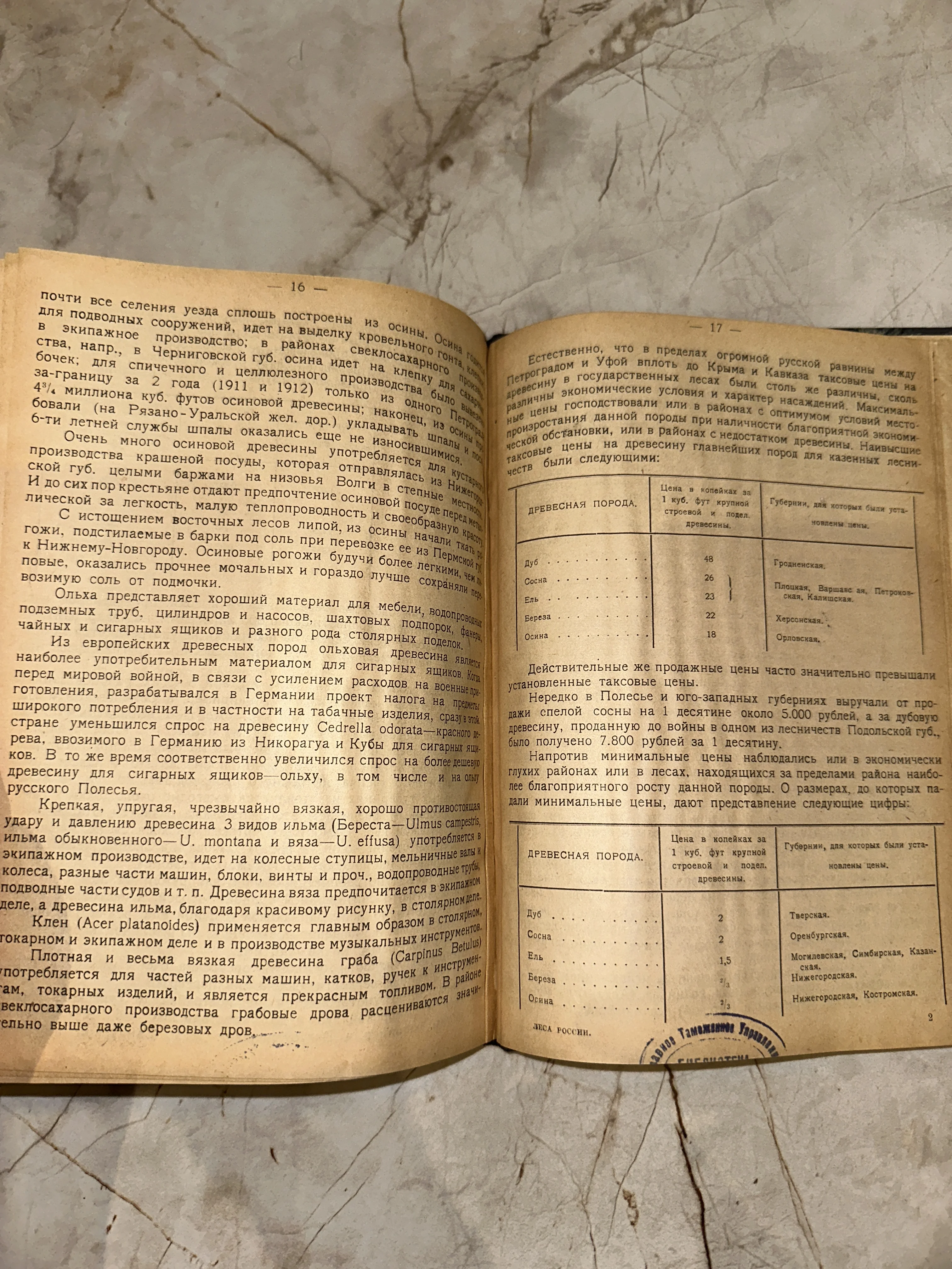 Разворот старой книги с текстом о свойствах древесины и таблицами цен по губерниям, видна печать Главного Таможенного Управления.