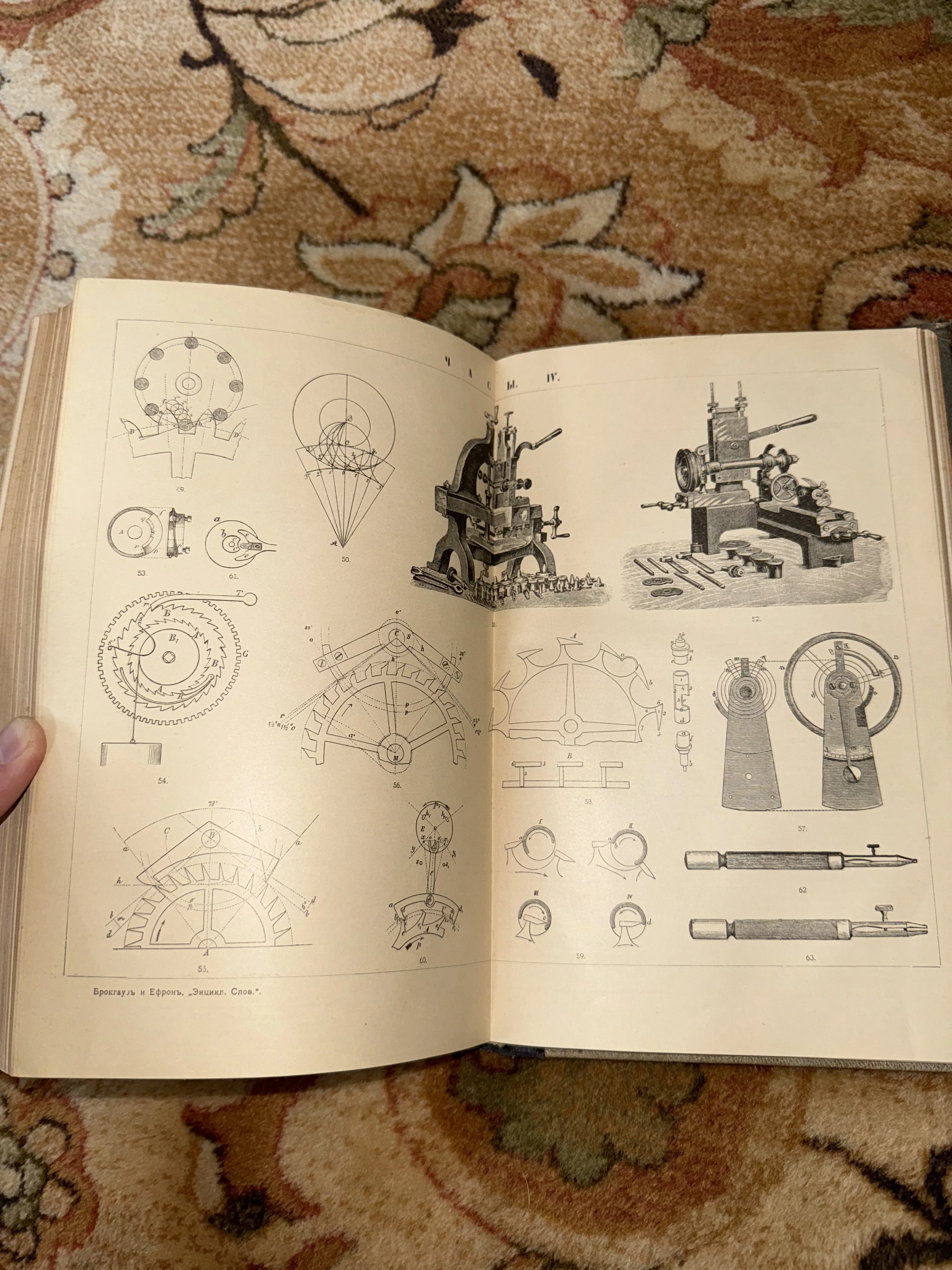 Изысканный разворот легендарного энциклопедического словаря демонстрирует триумф инженерной мысли рубежа веков. Тончайшие гравюры с изображением сложных узлов и инструментов сохранили поразительную четкость на благородно состаренной бумаге. Этот предмет представляет исключительный интерес как образец классической книжной графики и памятник истории технического прогресса.