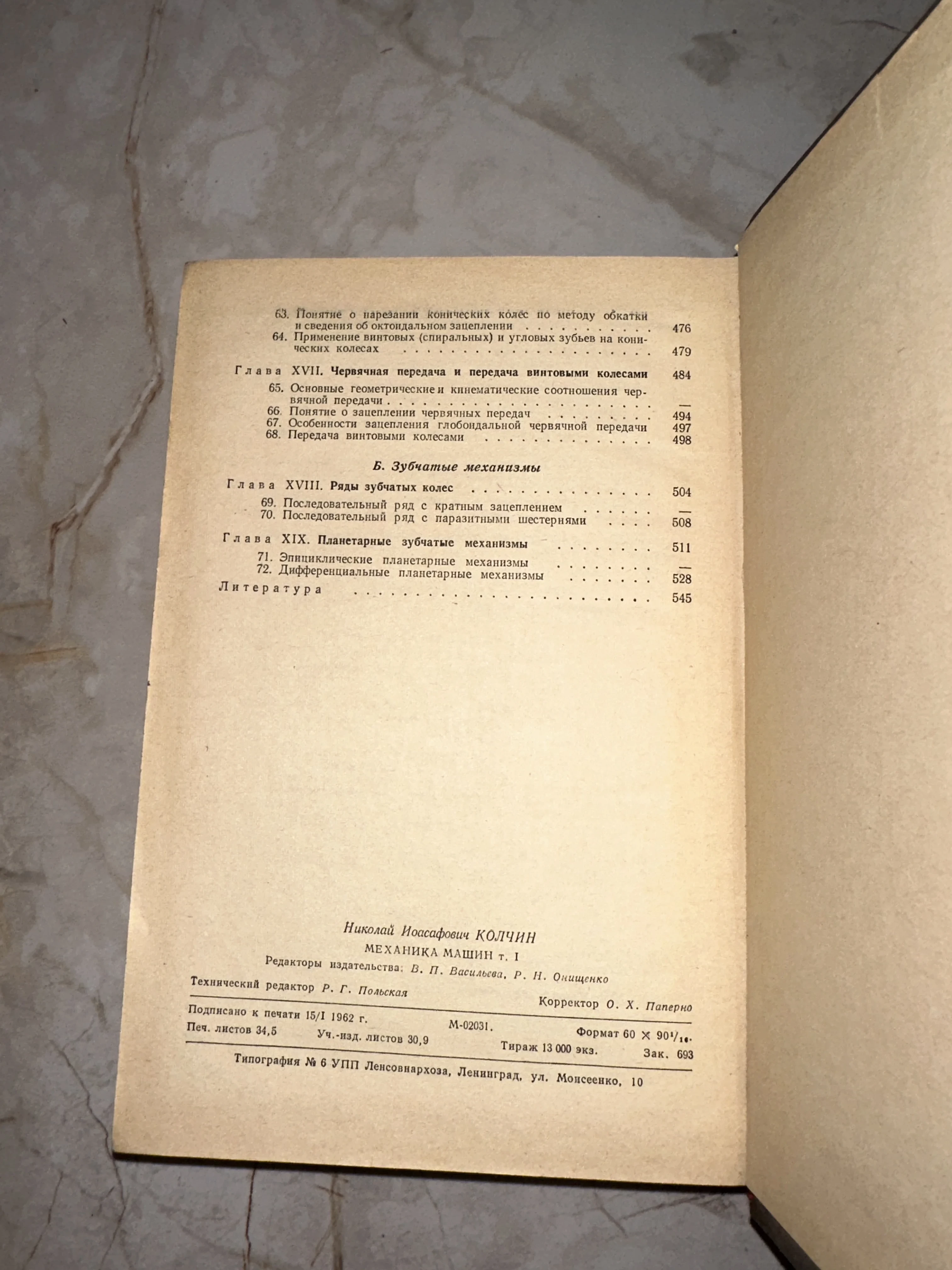Оглавление и выходные данные книги «Механика машин» Н. И. Колчина, 1962 год