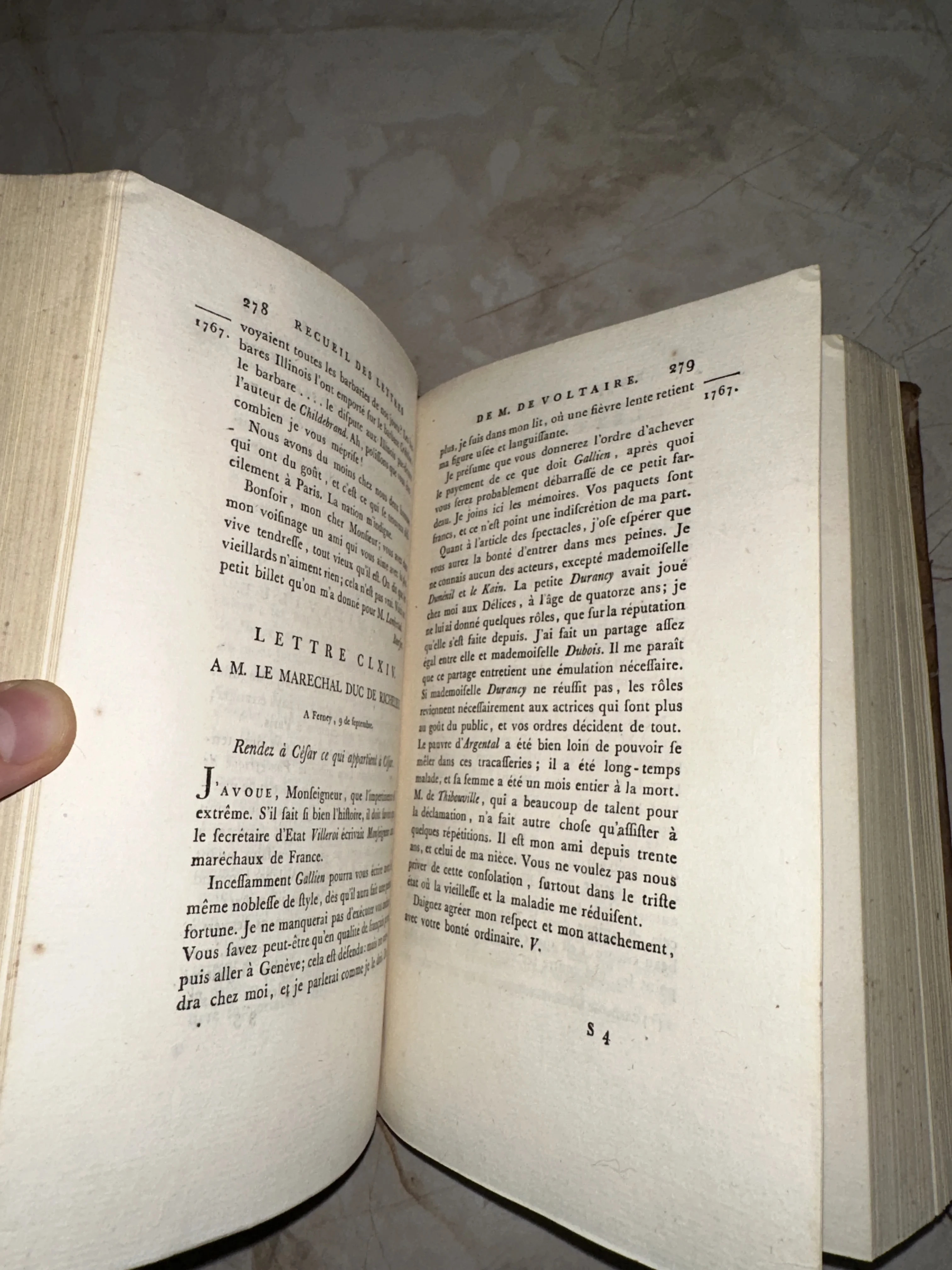 Редкое прижизненное или раннее посмертное издание переписки великого французского философа Вольтера, датированное 1767 годом. Плотная бумага верже сохранила благородную патину времени и четкий оттиск антикварного шрифта, характерного для эпохи Просвещения. Этот экземпляр станет жемчужиной частной коллекции, предлагая прикоснуться к живой истории европейской мысли XVIII века.