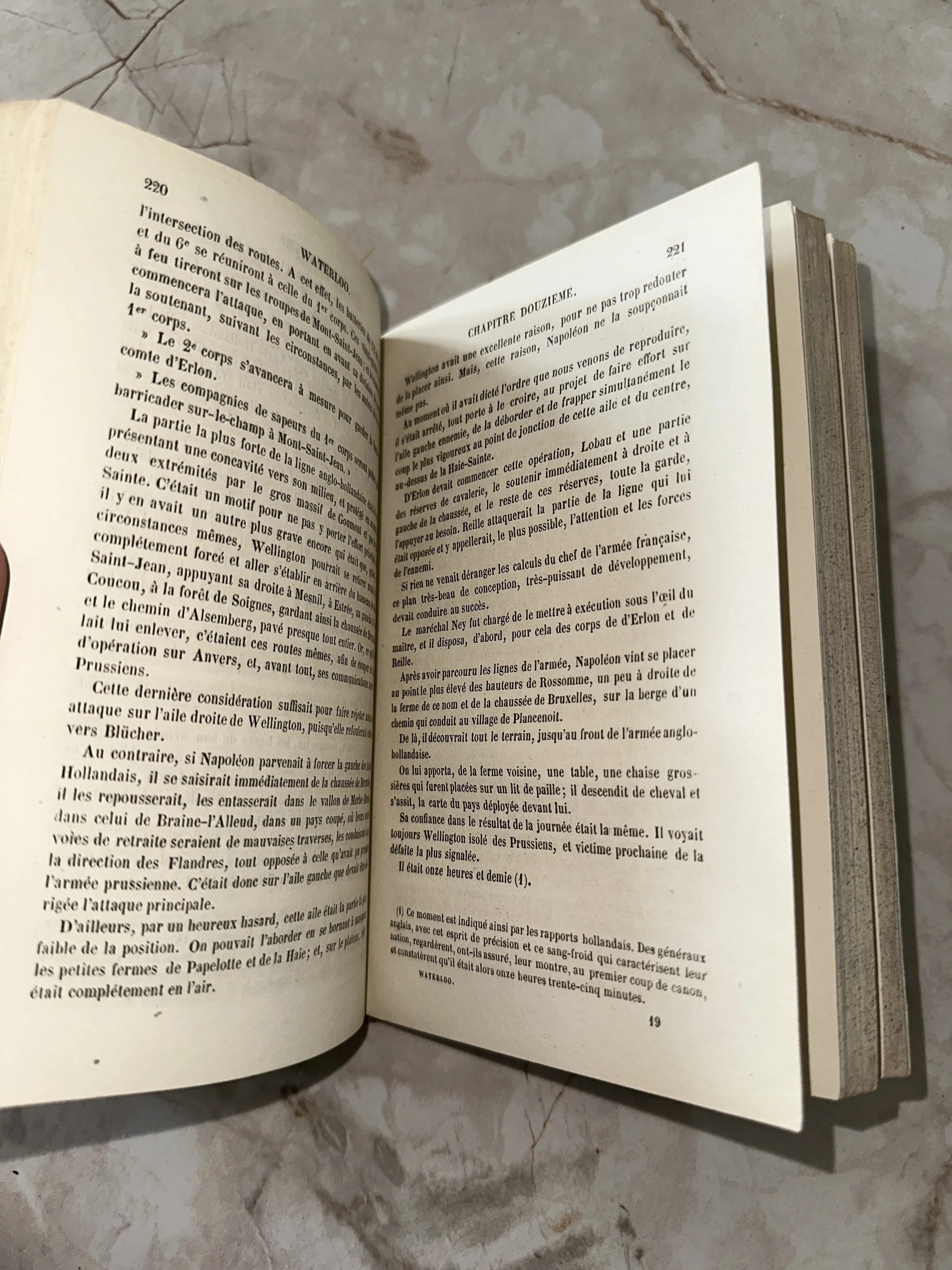 Антикварное издание, повествующее о драматических событиях битвы при Ватерлоо, сохранившее дух европейской истории XIX века. Текст на французском языке детально описывает маневры Наполеона и Веллингтона на пожелтевших от времени, но отлично сохранившихся страницах. Настоящая находка для коллекционеров военно-исторической литературы и библиофилов.