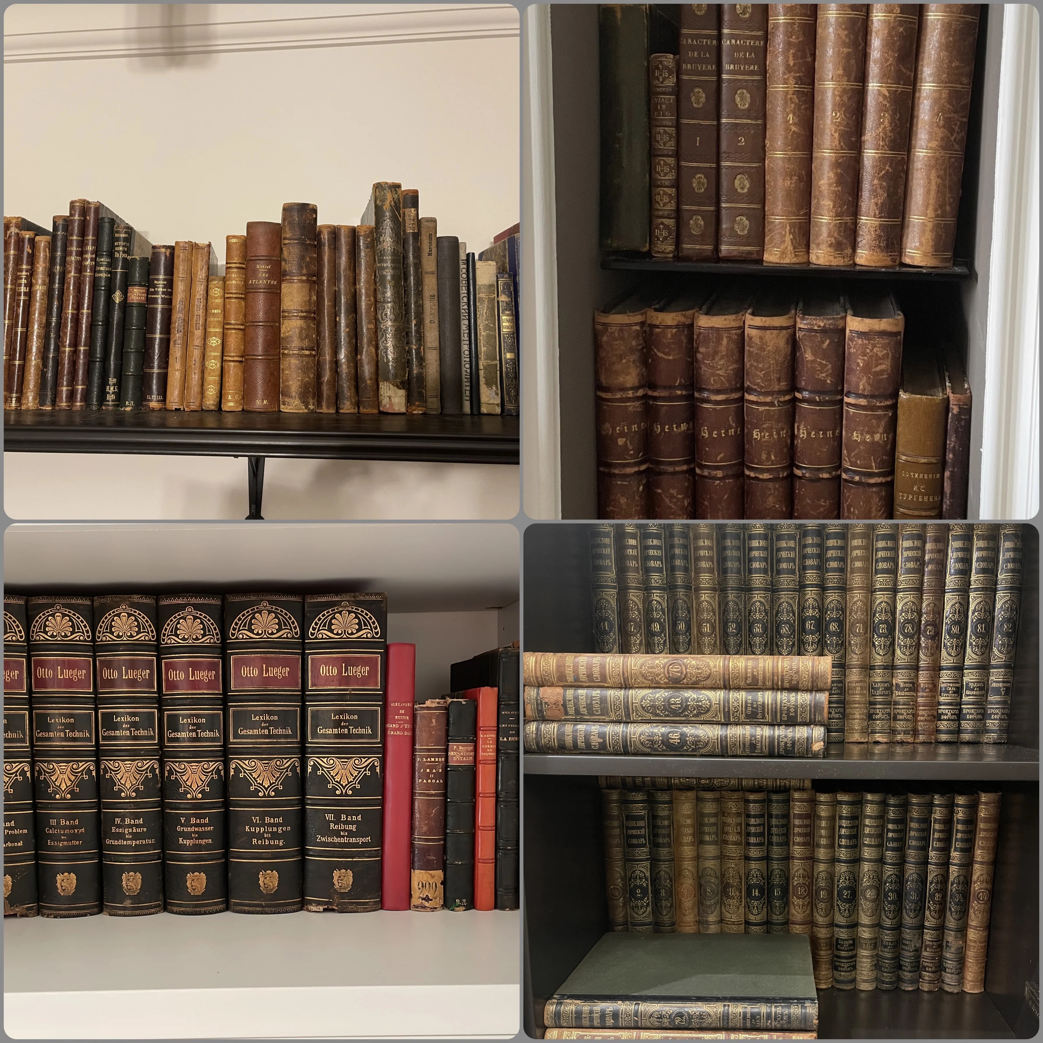 Коллаж из четырех фотографий книжных полок со старинными книгами, энциклопедиями Брокгауза и Ефрона и техническими словарями Отто Люгера.