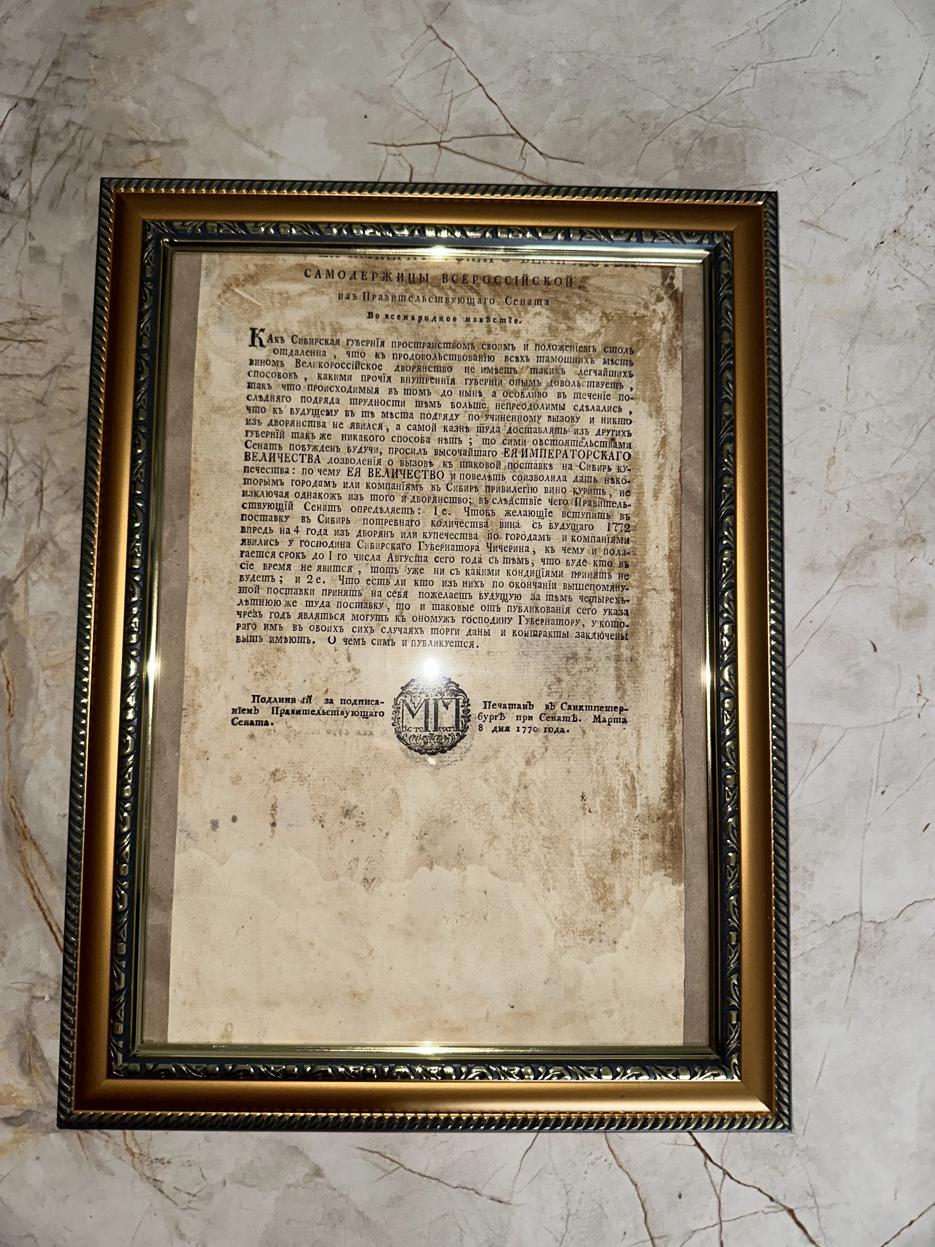 Перед вами подлинный исторический документ эпохи Екатерины Великой, напечатанный в Санкт-Петербурге в марте 1770 года. Текст посвящен вопросам продовольственного снабжения и винных откупов в далекой Сибирской губернии, представляя собой ценный артефакт административного управления империей. Бумага сохранила естественные следы времени и благородную патину, подчеркивающую её антикварный статус.