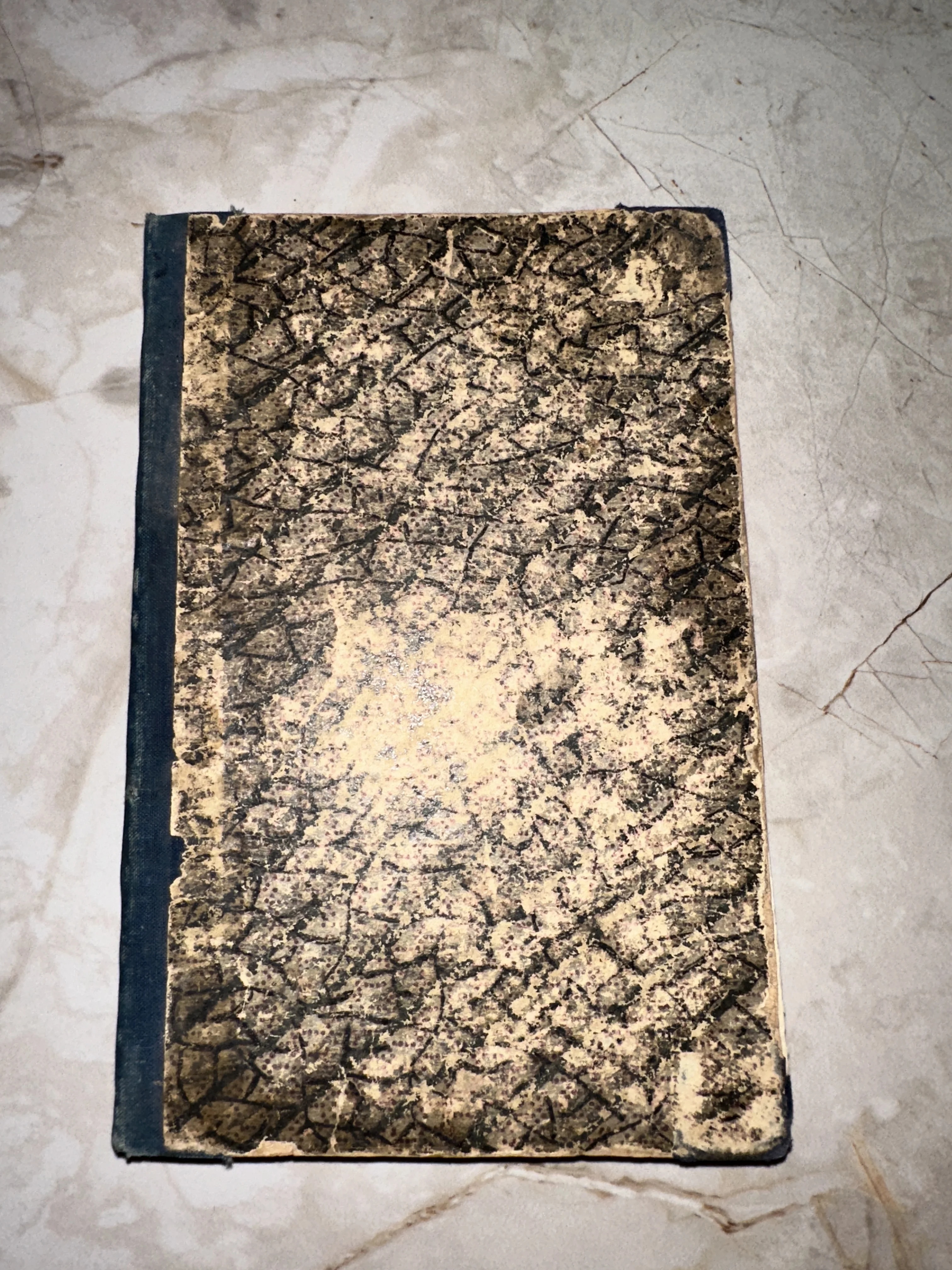 Старинная книга с характерным мраморным узором на обложке и синим тканевым корешком, вид сверху.