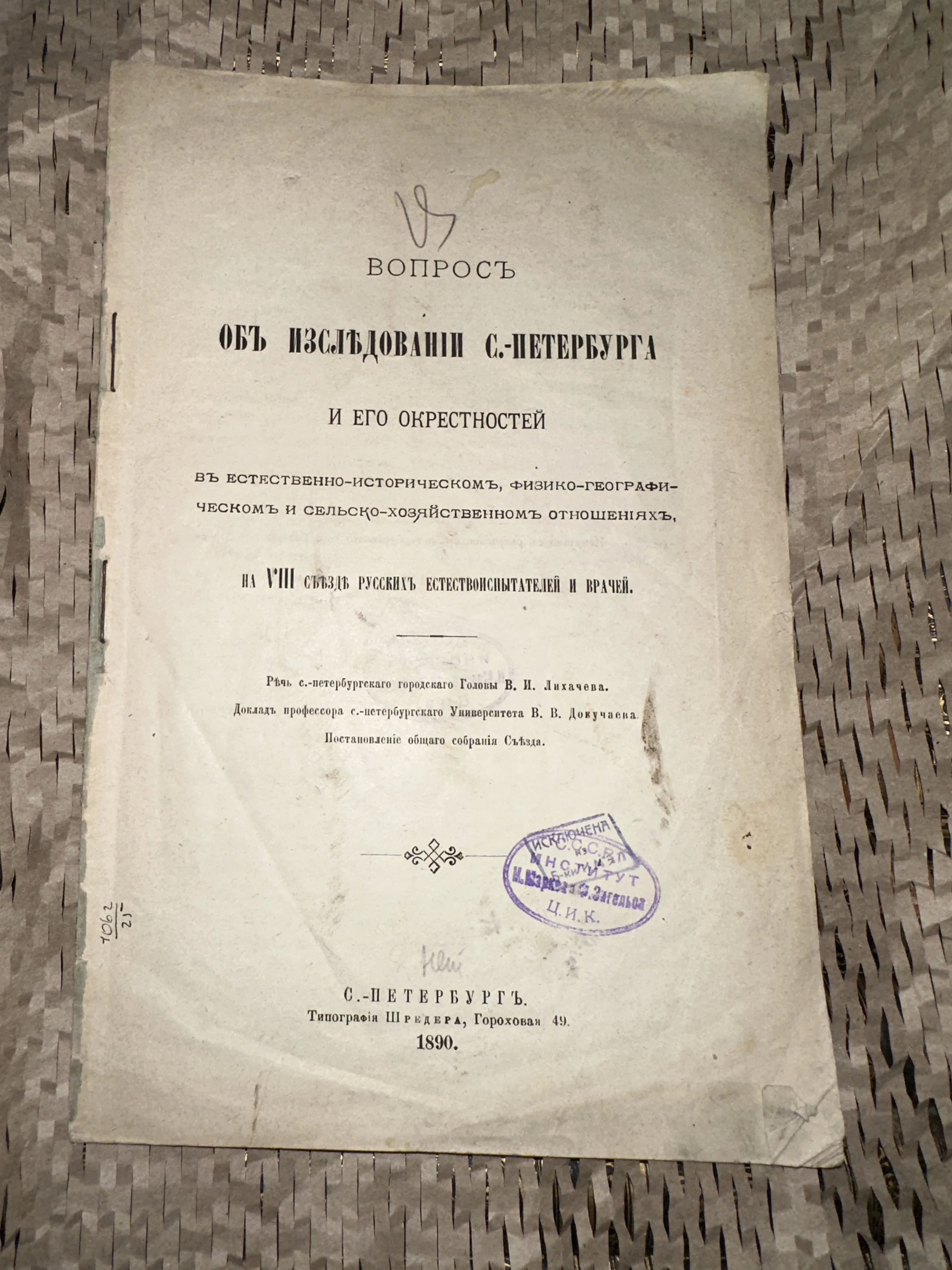 Редкое научное издание конца XIX века, содержащее программные доклады профессора В. В. Докучаева и городского головы В. И. Лихачева. Книга представляет огромный интерес для историков науки, а аутентичные библиотечные штампы и характерная патина времени делают ее ценным экземпляром для коллекции краеведческой литературы.