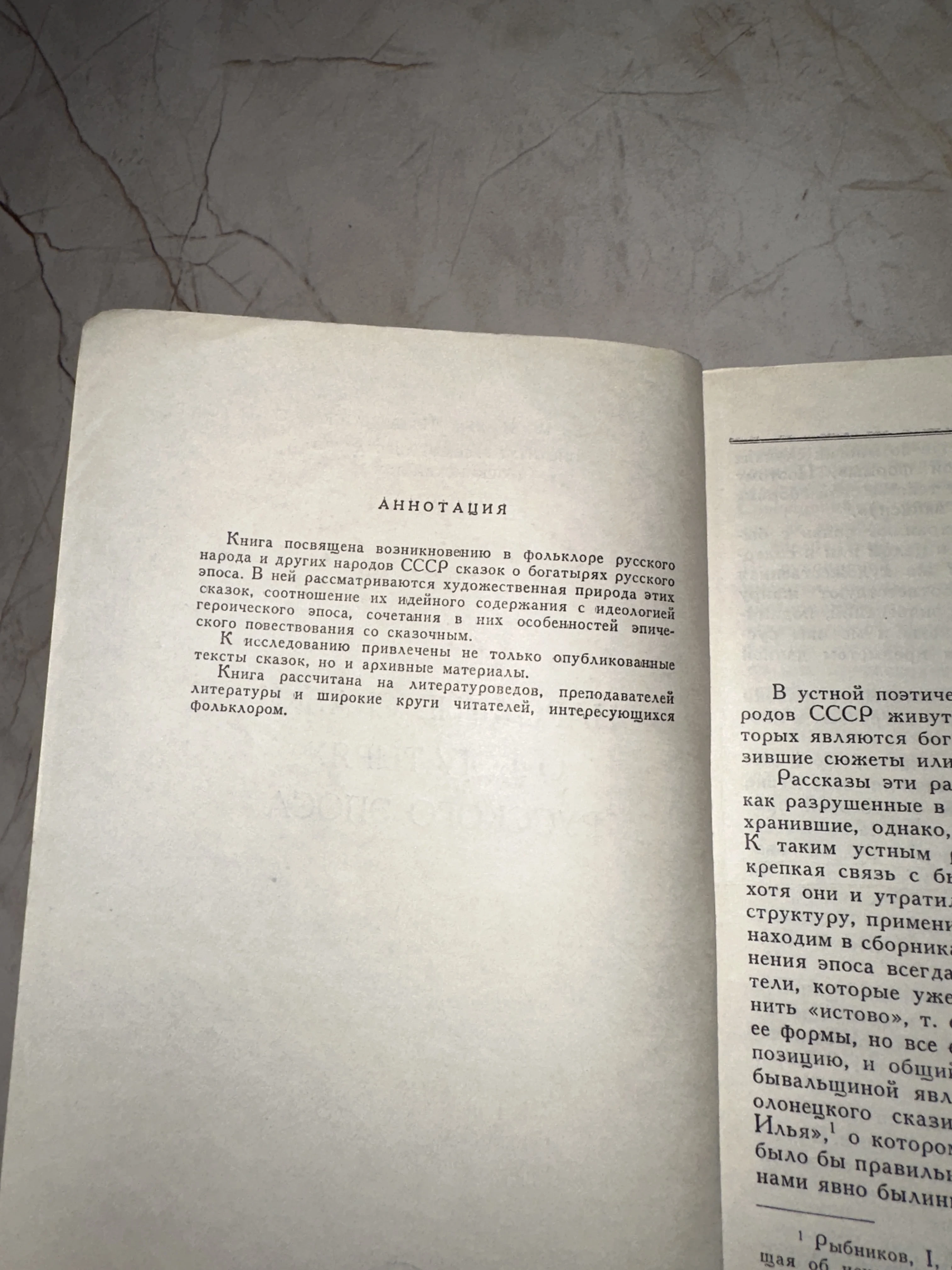 Фотография открытой страницы книги с заголовком Аннотация, содержащей текст о возникновении сказок про богатырей в фольклоре народов СССР.