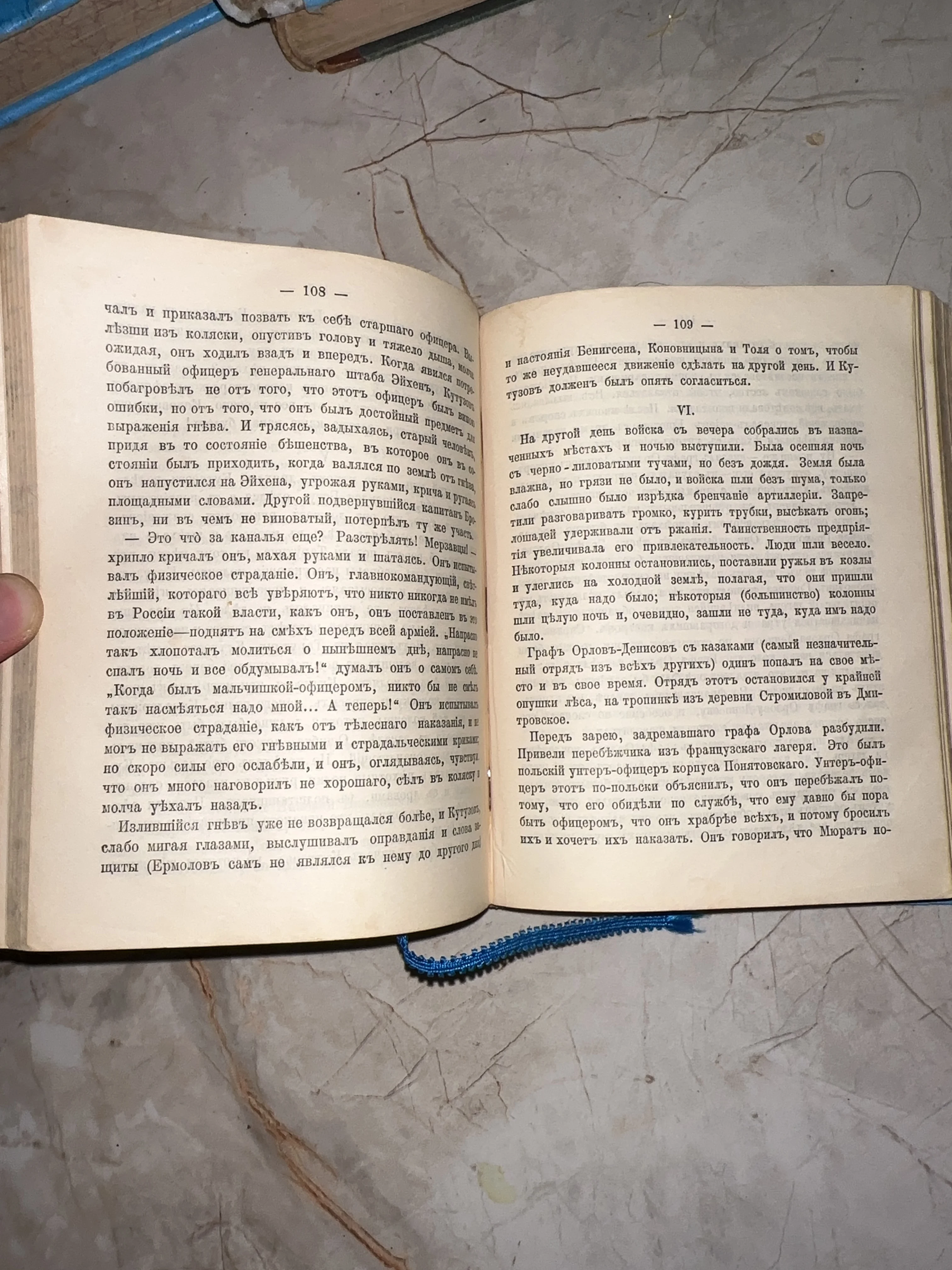 Разворот антикварной книги с текстом на русском языке в дореволюционной орфографии, страницы 108 и 109.