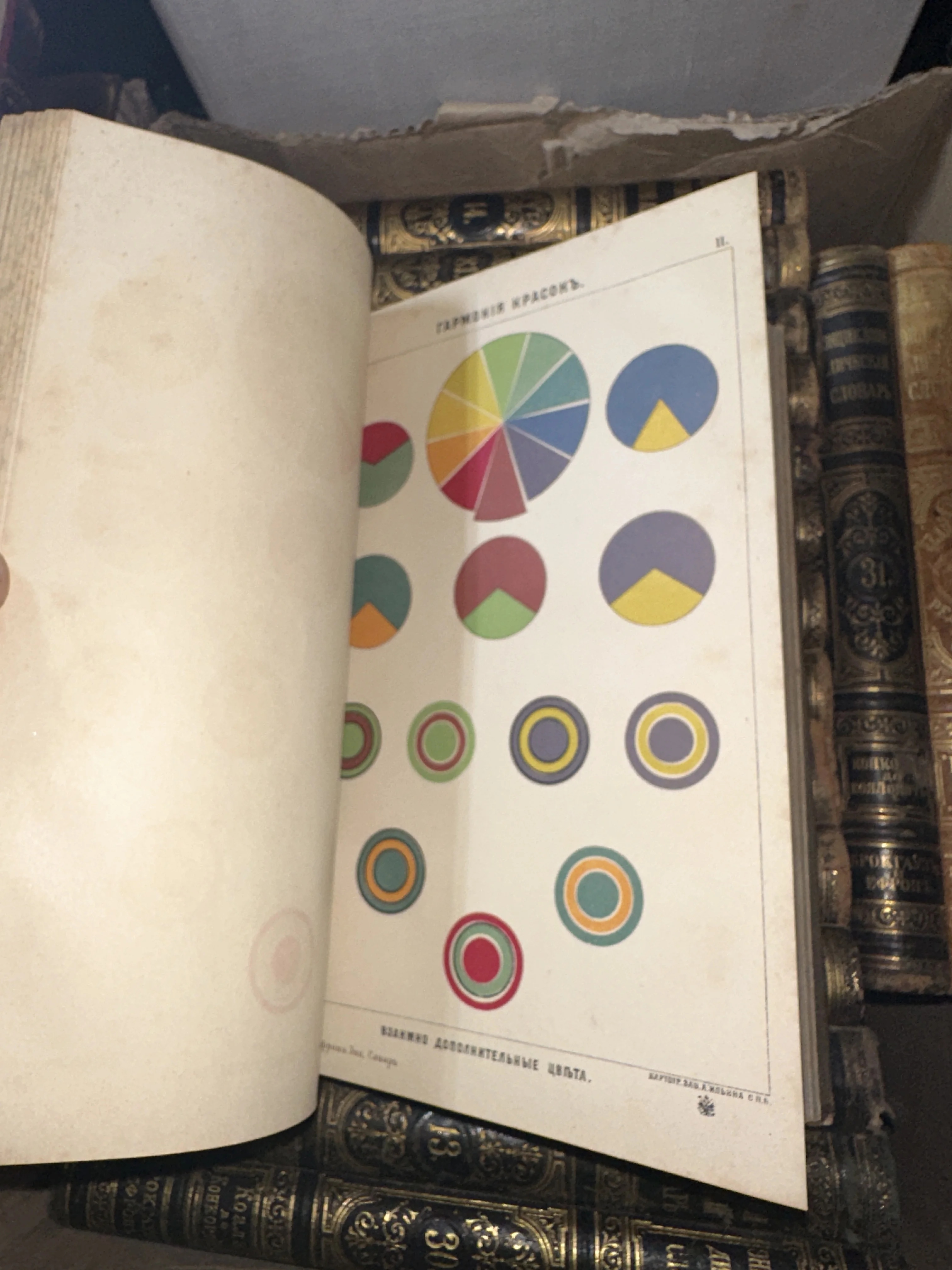 Изысканная литография из дореволюционного издания, наглядно представляющая классическую теорию цветовой гармонии. Пожелтевшая от времени бумага и аккуратные цветовые схемы передают дух академической науки конца XIX века, превращая страницу в самостоятельный объект искусства. Прекрасный образец книжной графики, сохранившийся в достойном состоянии среди томов фундаментальных энциклопедических словарей.