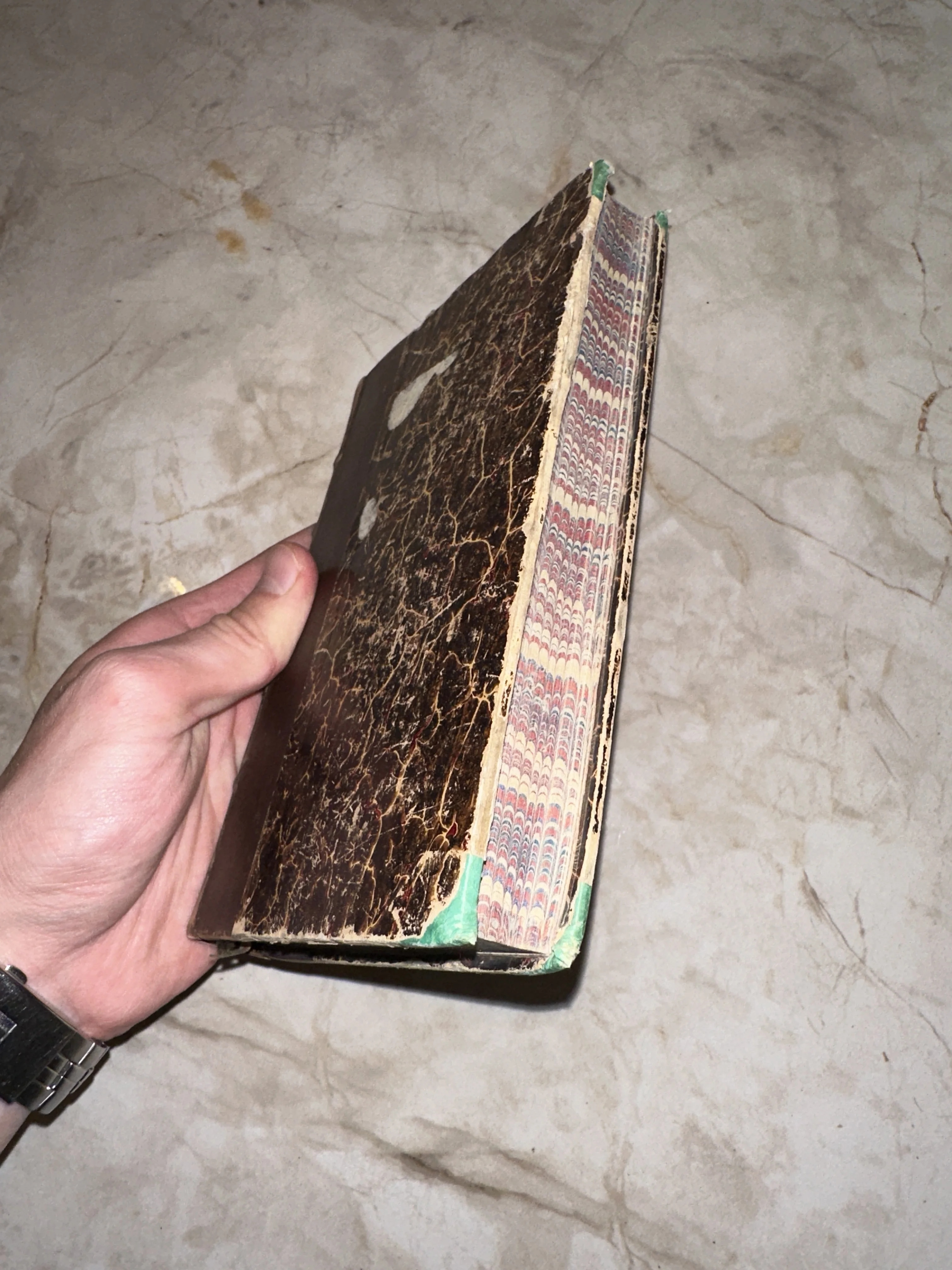 Уникальный экземпляр в полукожаном переплете, украшенный изысканным мраморным обрезом, который сохранил яркость красок. Характерные следы времени на обложке подчеркивают подлинность и богатую историю этого издания, делая его ценным приобретением для домашней библиотеки.
