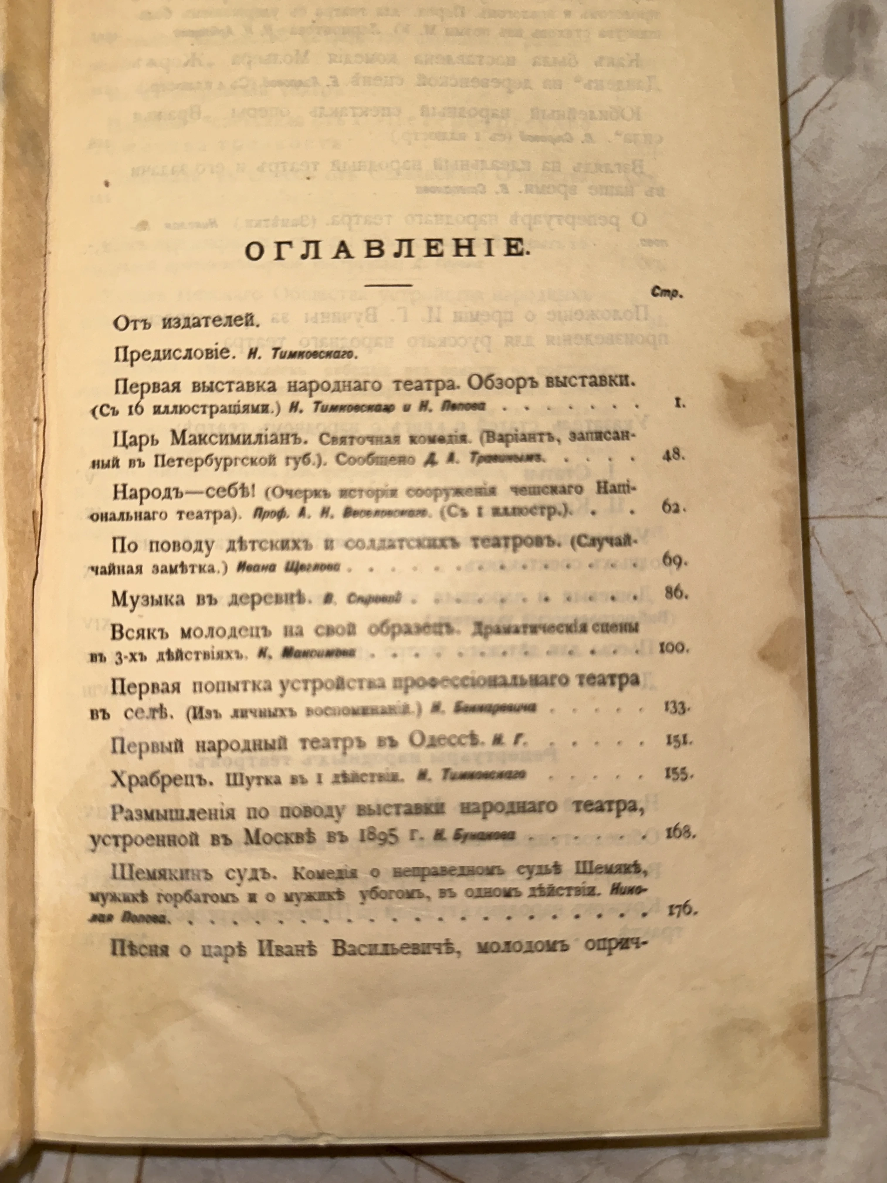 Перед вами аутентичная страница оглавления редкого дореволюционного сборника, посвященного истории народного и профессионального театра. Пожелтевшая от времени бумага с характерными патинами и старинная орфография создают неповторимую атмосферу интеллектуального прошлого России. Идеальный артефакт для коллекционеров театральной литературы и исследователей культуры начала XX века.