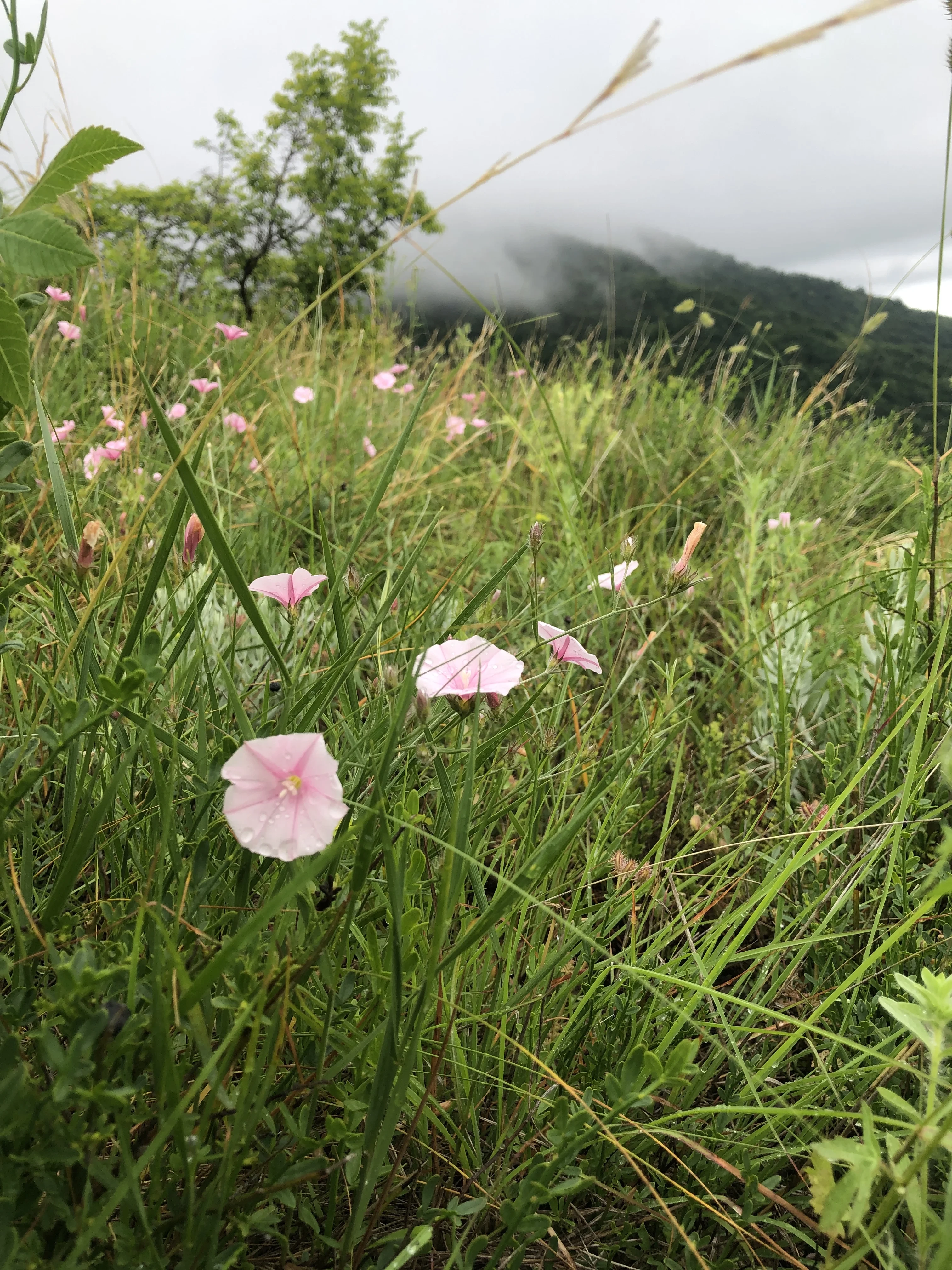 Полевые вьюнки на фоне туманных гор