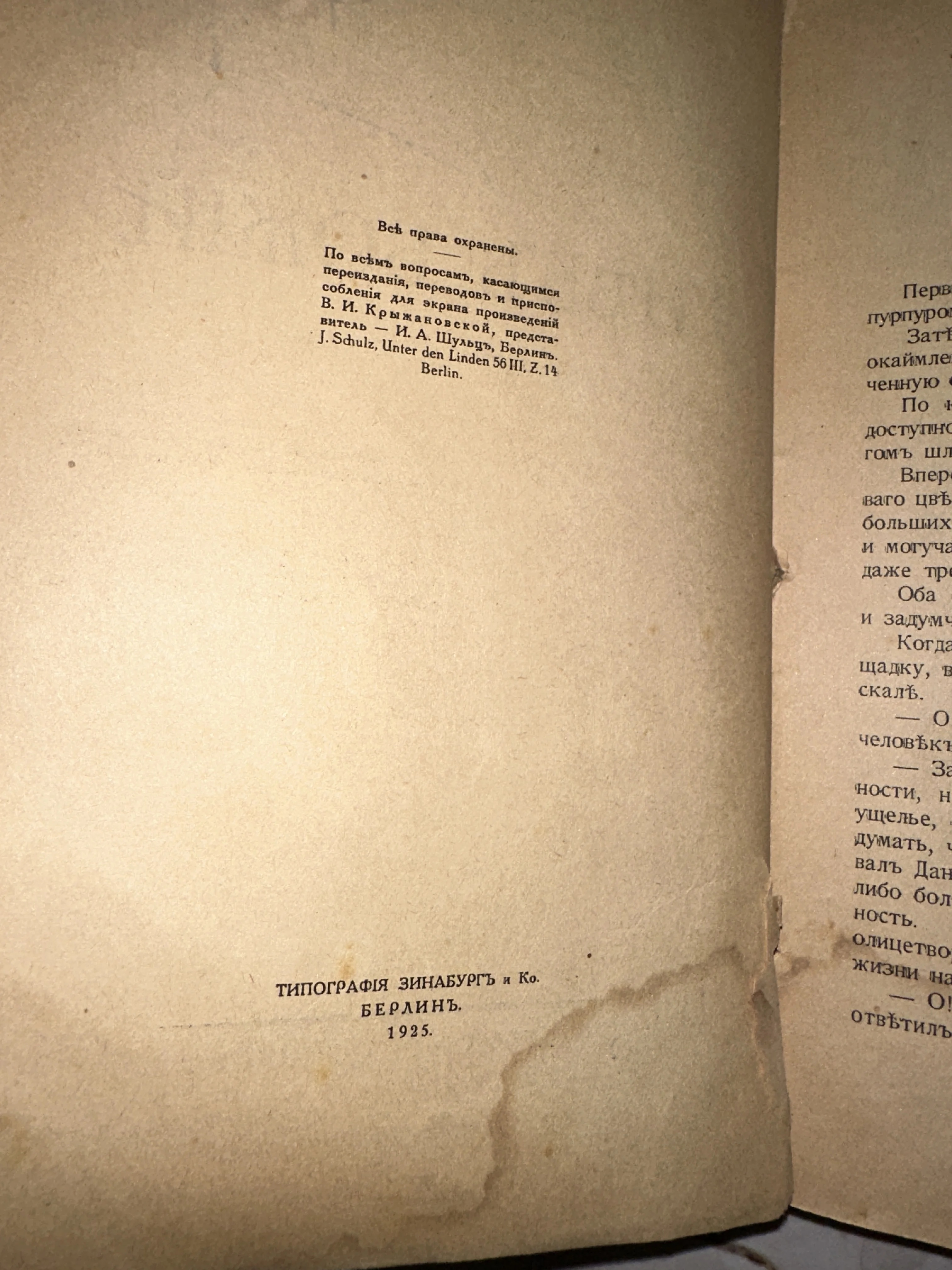Уникальный свидетель эпохи русского зарубежья — страница из книги Веры Крыжановской, изданной в Берлине. Пожелтевшая от времени бумага с характерными пятнами и дореволюционной орфографией передает неповторимый дух 1920-х годов. Настоящая находка для коллекционеров редких эмигрантских изданий и любителей мистической прозы начала века.