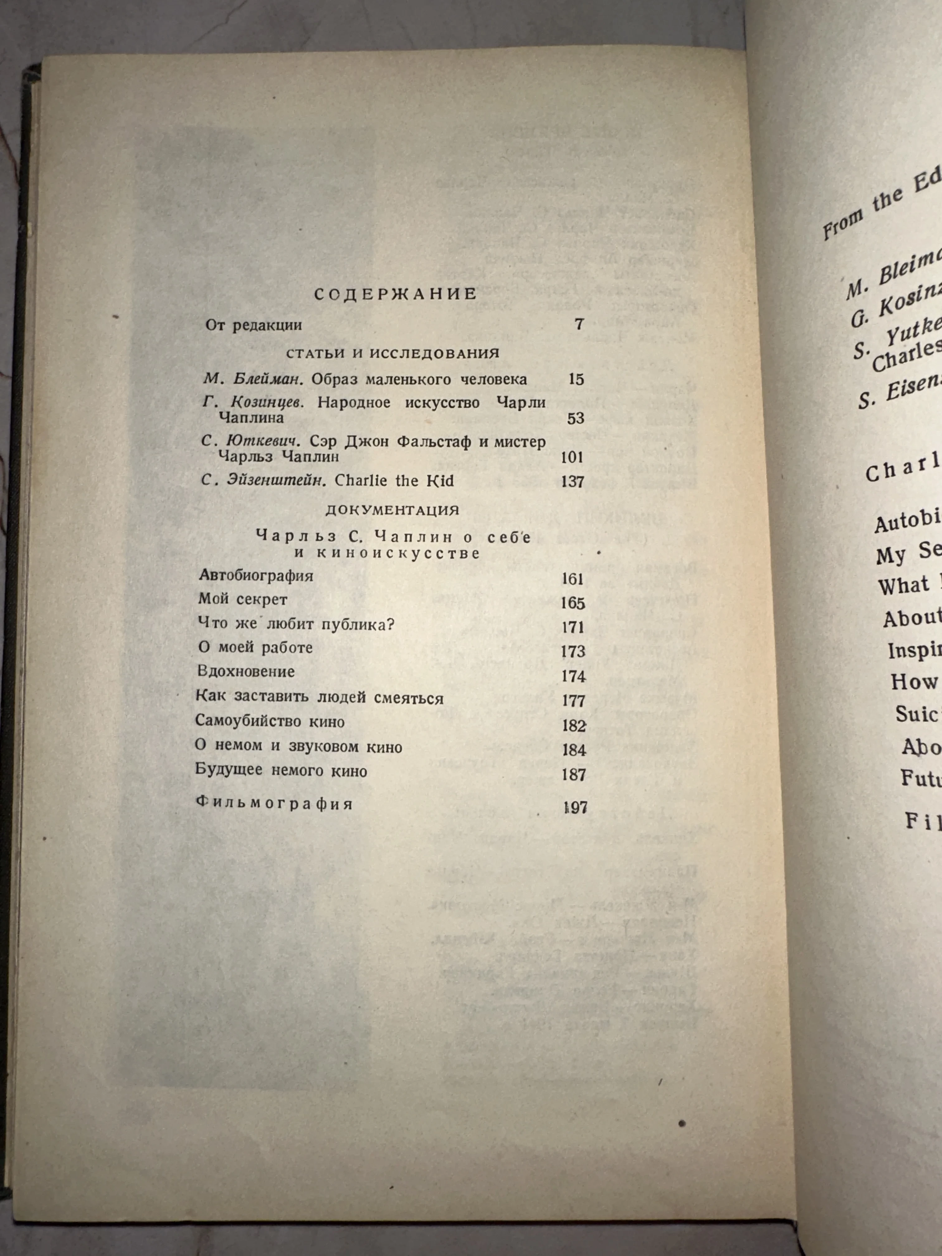 Фотография страницы с оглавлением советского издания, посвященного Чарльзу Чаплину, со статьями Эйзенштейна и Козинцева.
