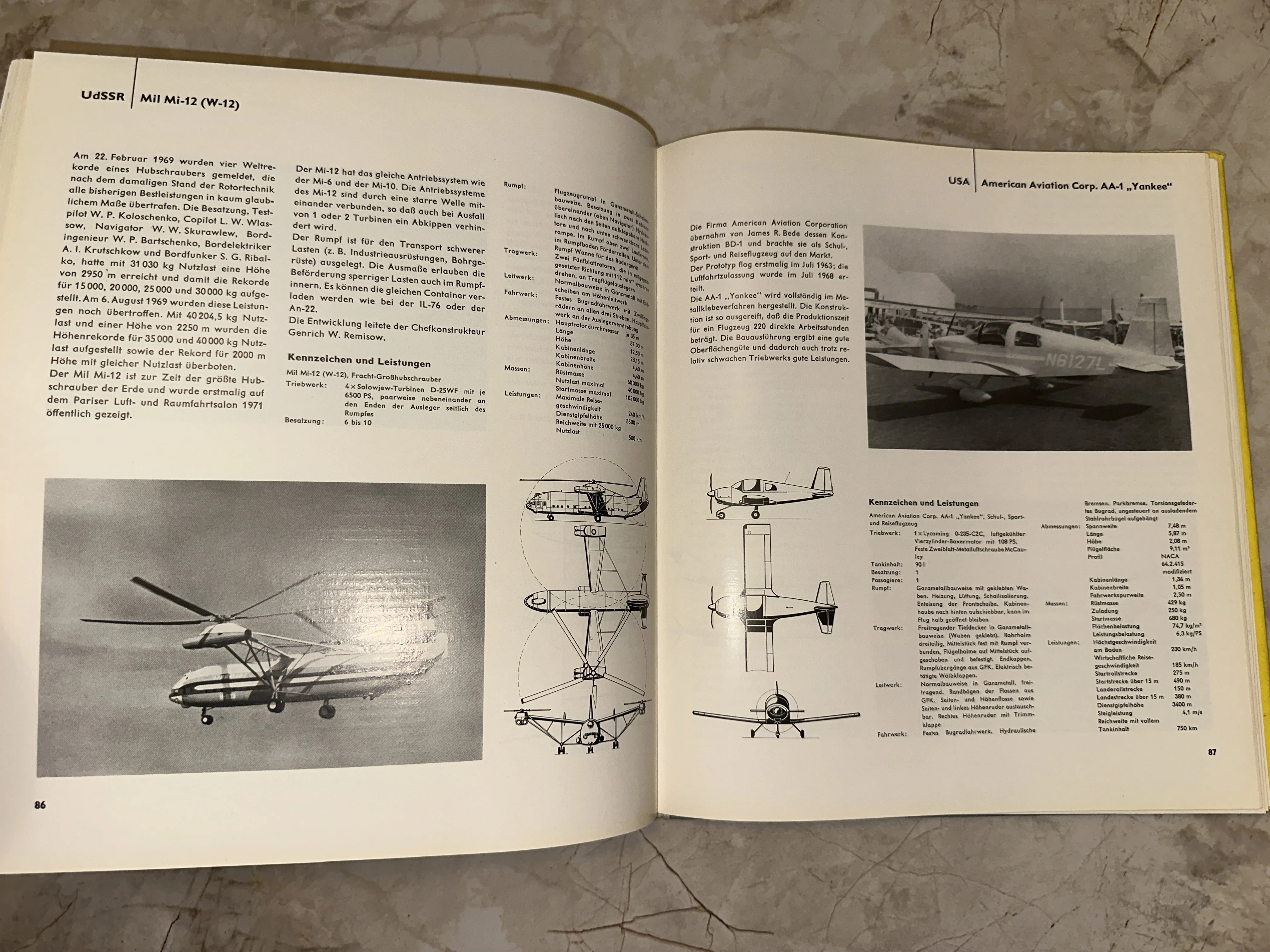 Разворот старой книги на немецком языке с фотографиями и чертежами советского вертолета Ми-12 и американского самолета AA-1 Yankee.