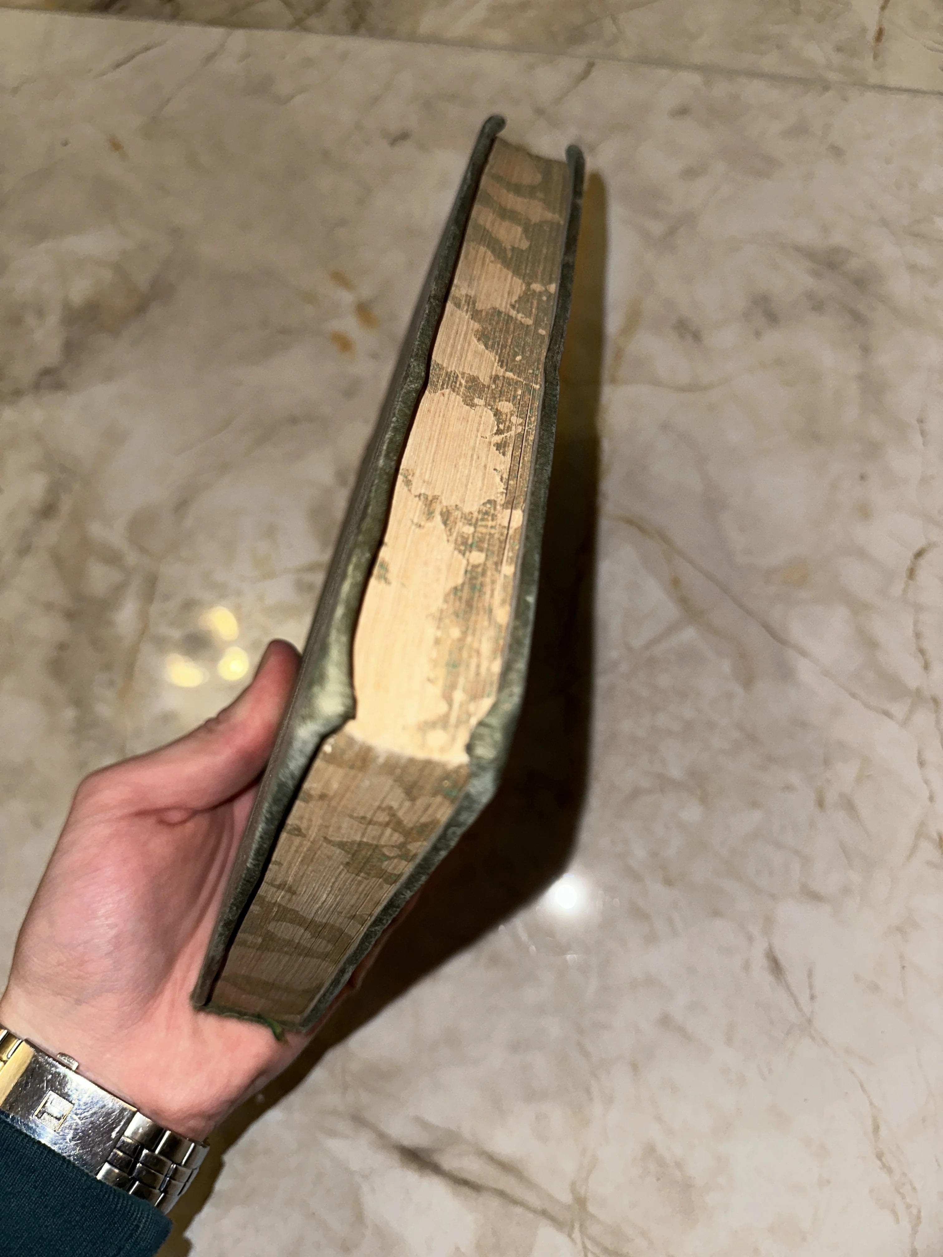 Вид сверху на обрез старой книги с крапчатым узором в руке человека на фоне мраморной поверхности.