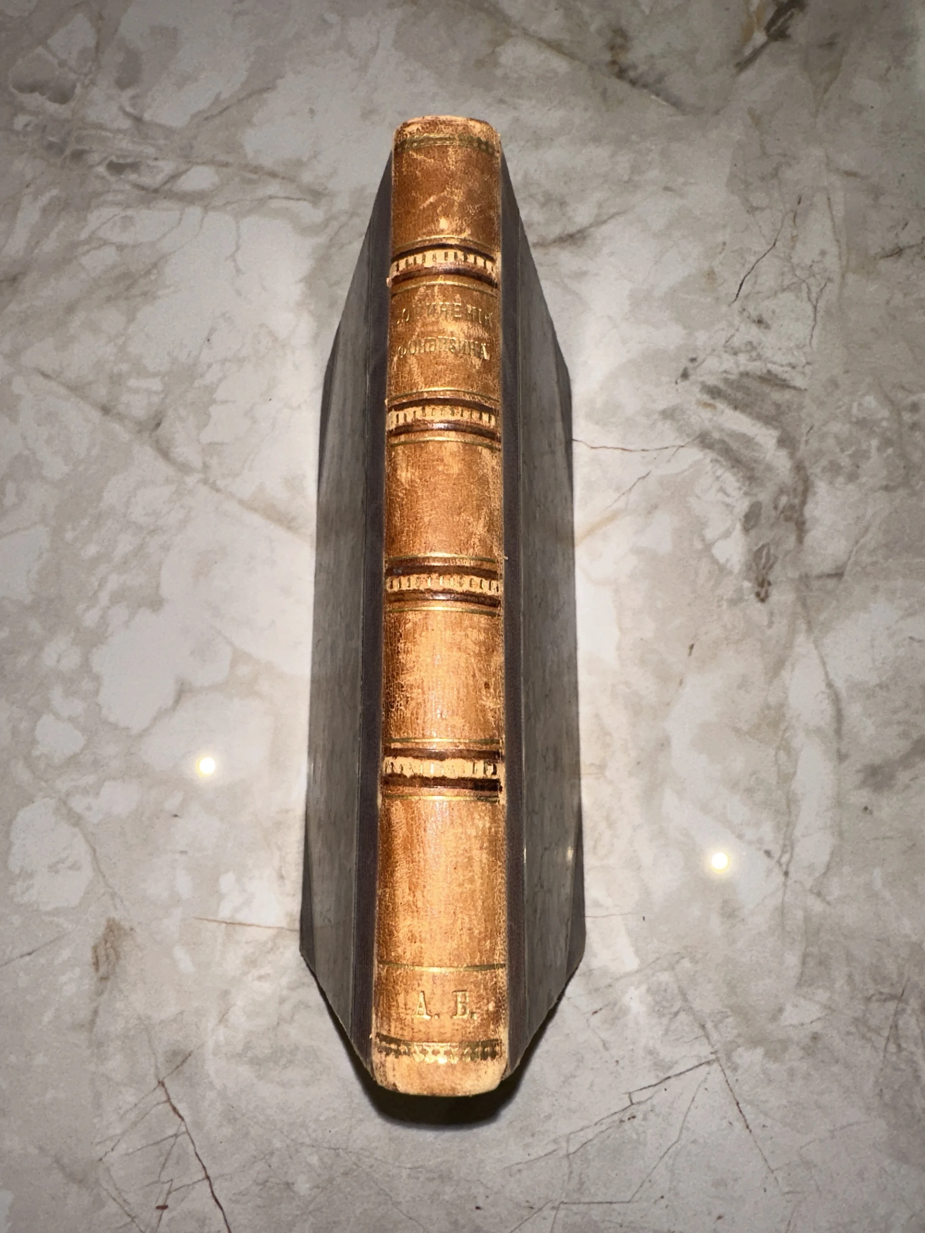 Изящный кожаный корешок с классическими бинтами и сохранившимся золотым тиснением передает дух дореволюционных частных библиотек. Благородная патина времени и инициалы владельца на нижней части переплета придают этому экземпляру особую историческую ценность и уникальный характер. Издание сохранило свою стать и станет статусным дополнением к коллекции русской классики.