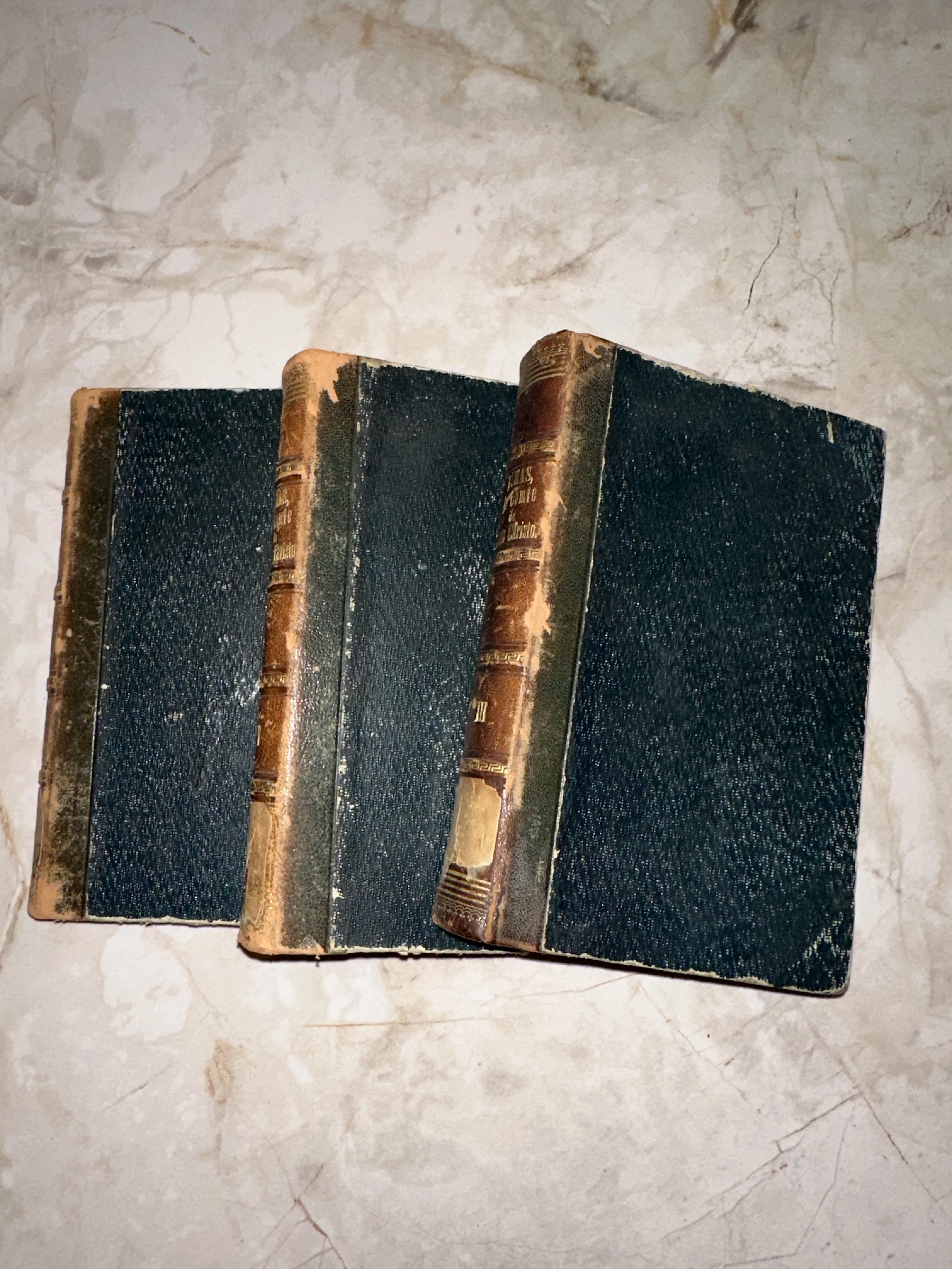 Три антикварных тома с потертыми кожаными корешками и золотым тиснением на светлой мраморной поверхности.