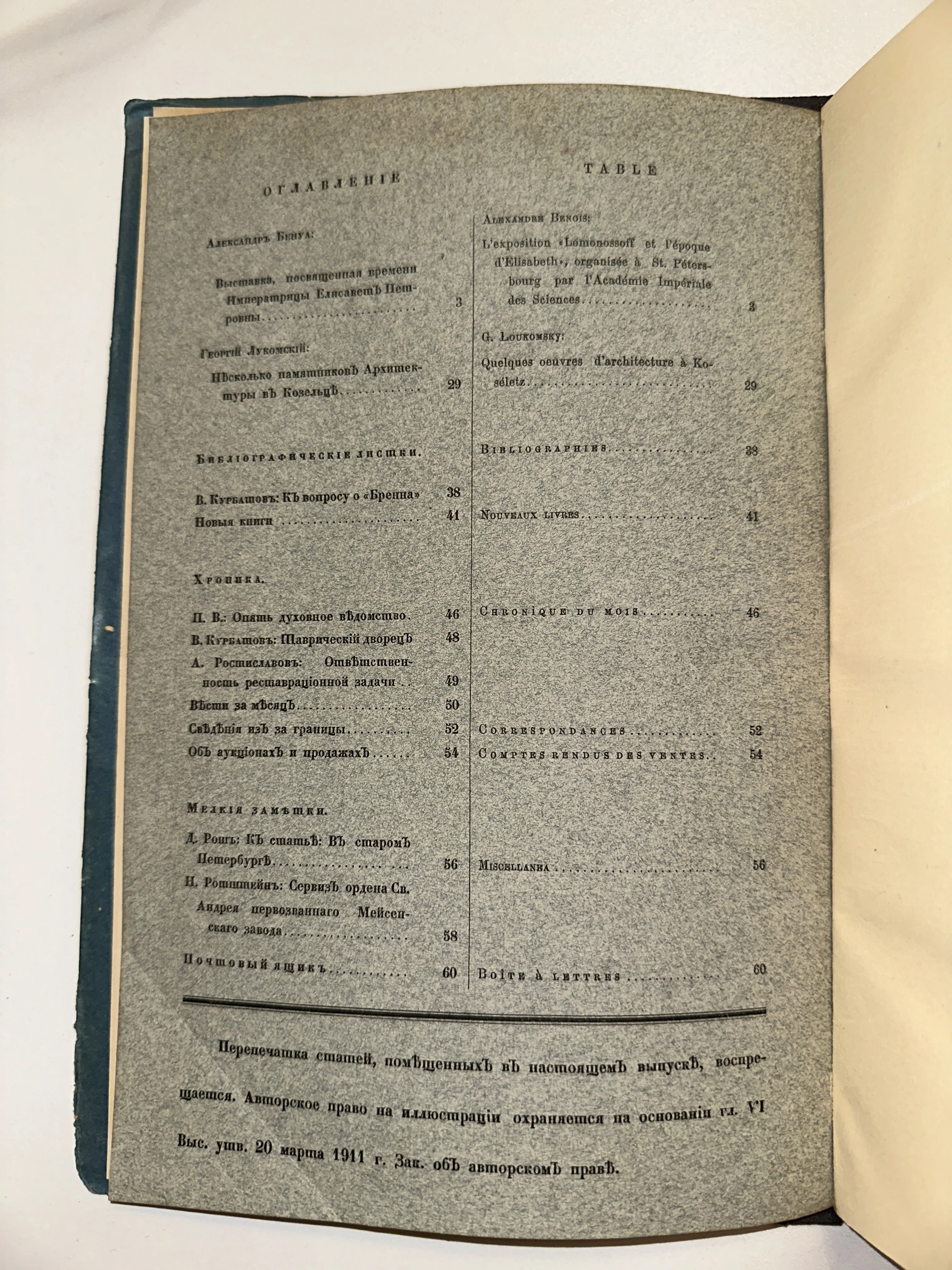 Страница оглавления старинного журнала на русском и французском языках с упоминанием Александра Бенуа и Георгия Лукомского.