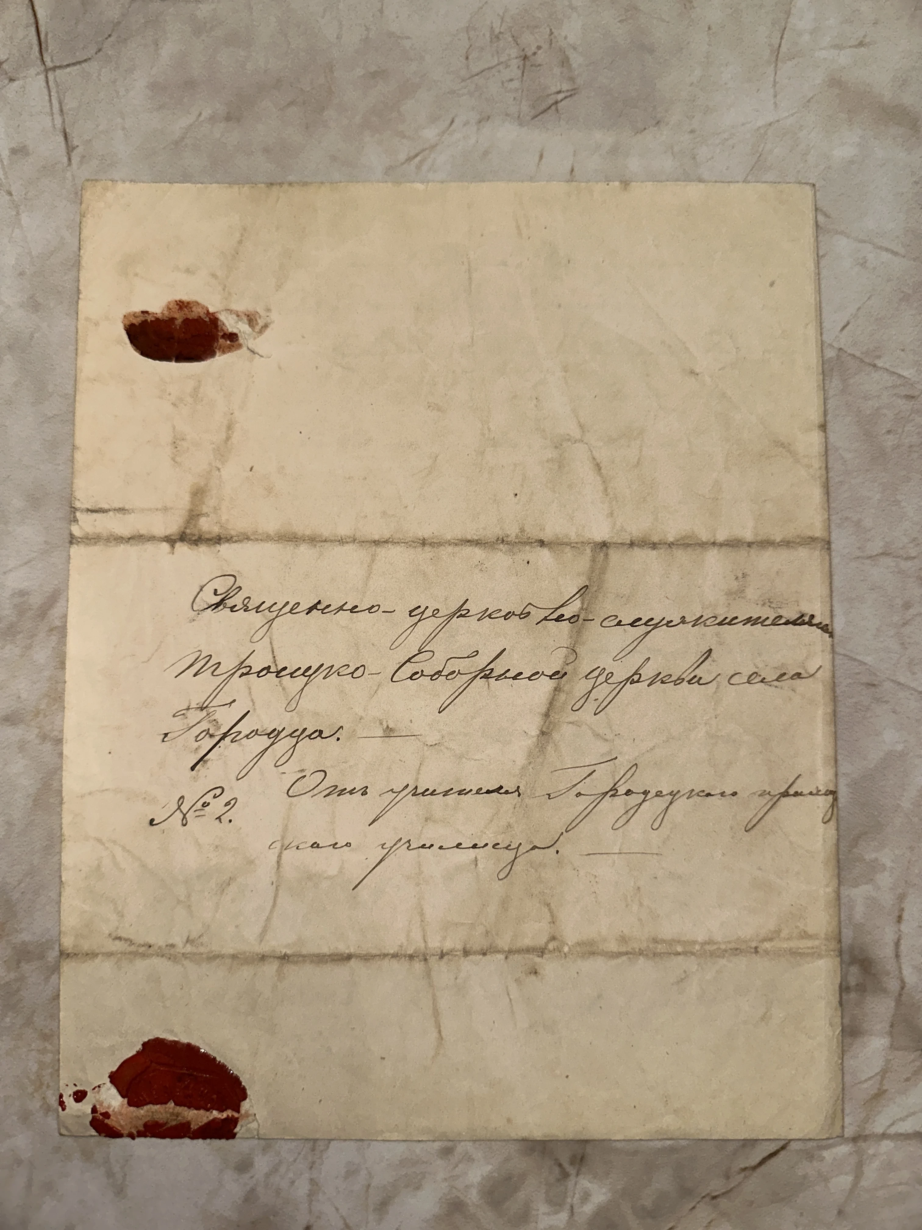 Подлинное рукописное послание от учителя Городецкого приходского училища, адресованное служителям Троицко-Соборной церкви. Документ несет на себе печать времени в виде благородной патины, характерных складок и сохранившихся фрагментов красного сургуча. Изящная дореволюционная каллиграфия и исторический контекст делают это письмо ценным артефактом для коллекционеров церковной старины и краеведов.