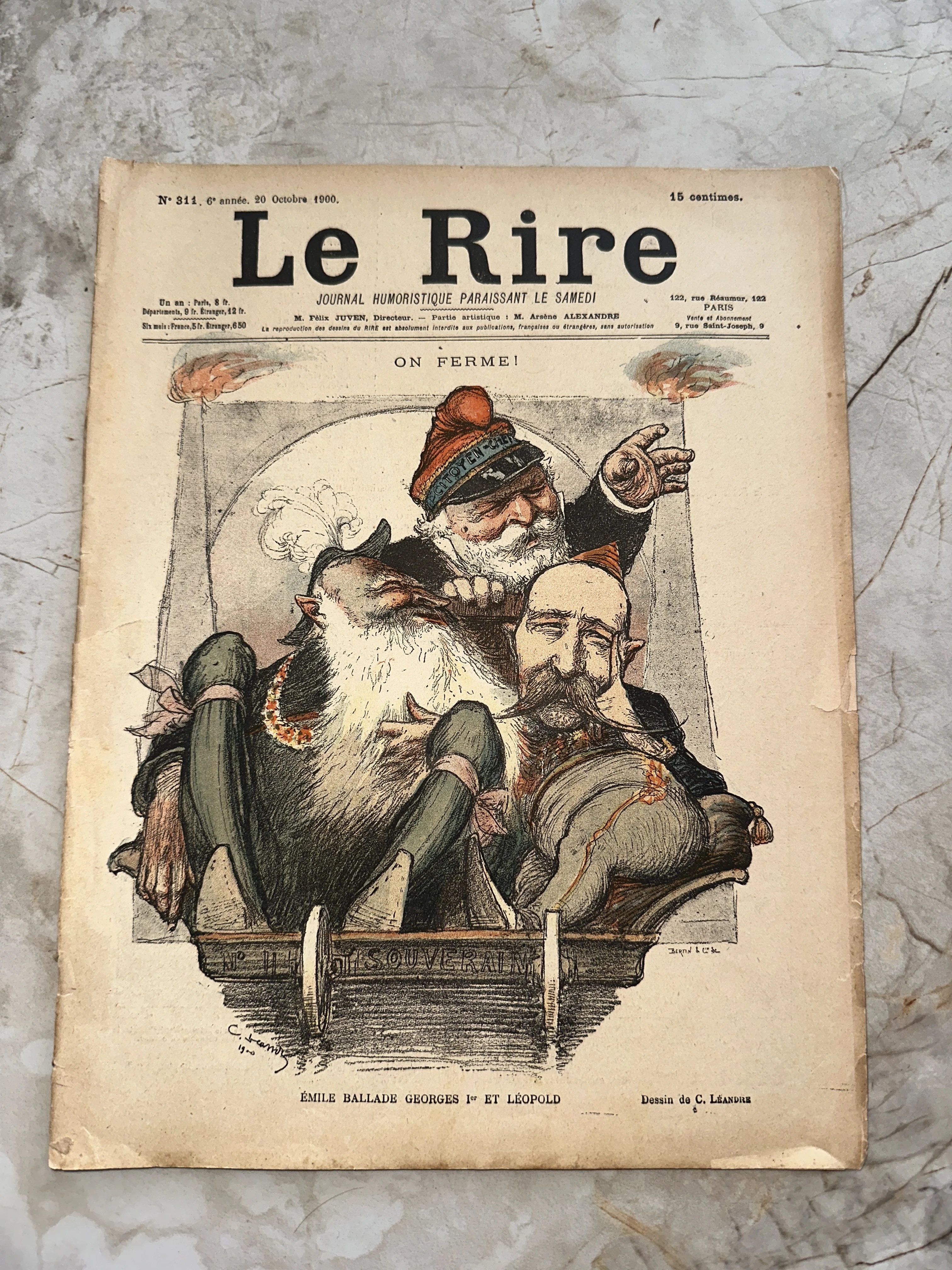 Обложка антикварного французского журнала Le Rire за 20 октября 1900 года с цветной карикатурой Шарля Леандра.