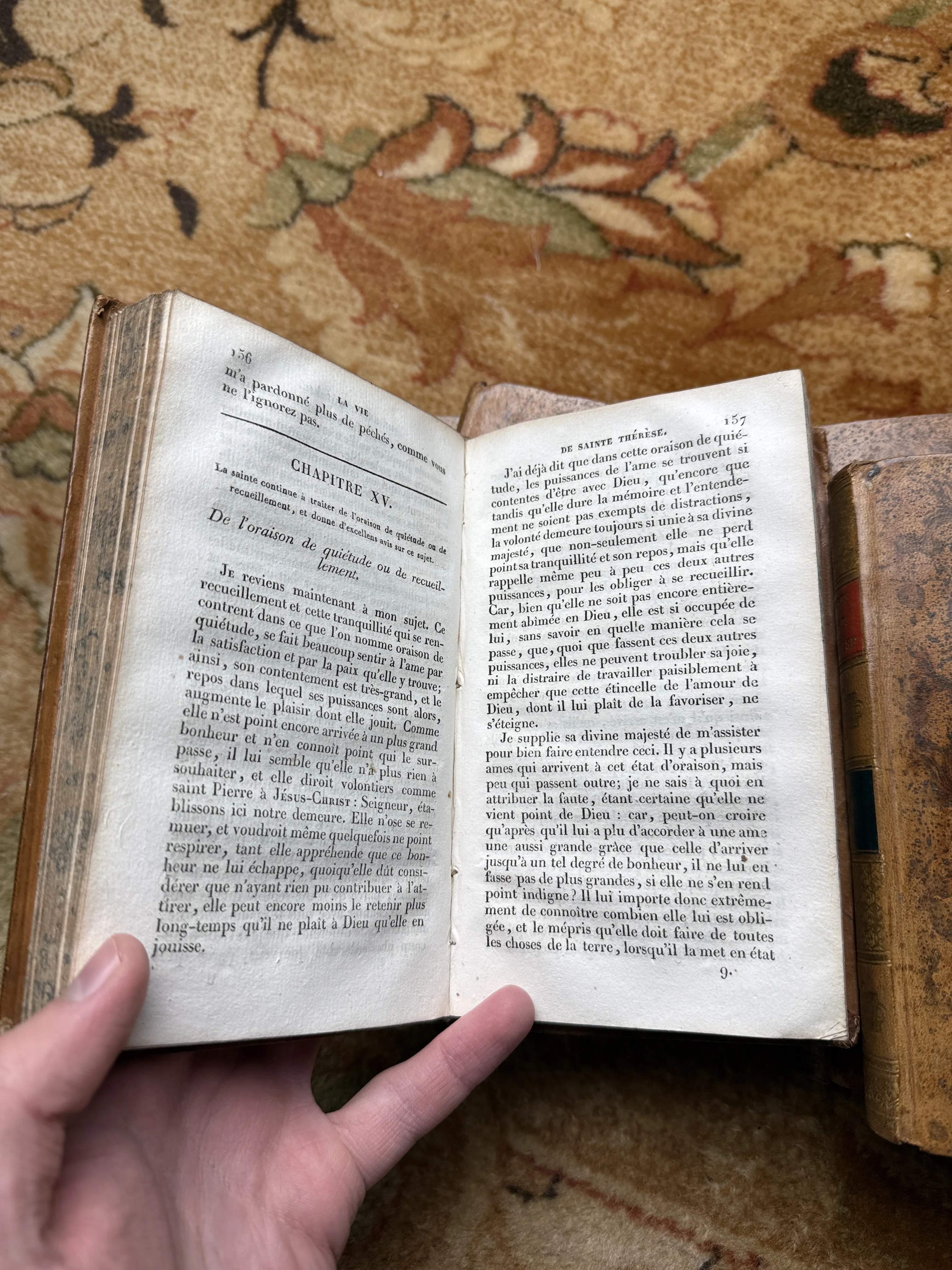 Разворот антикварной книги на французском языке с текстом о Святой Терезе, пожелтевшие страницы с типографским шрифтом XVIII-XIX века.