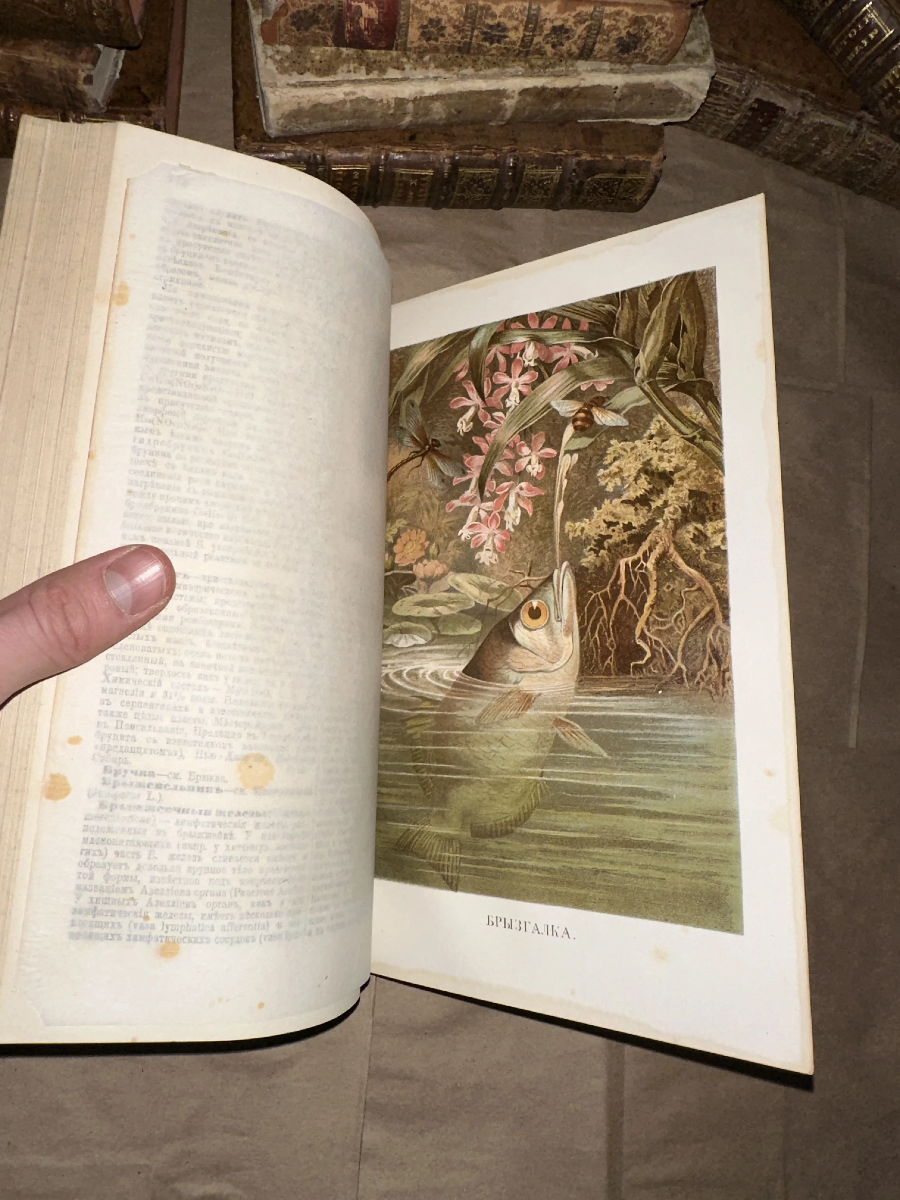 Эта редкая цветная иллюстрация из антикварного тома поражает детализацией и насыщенностью палитры, сохранившейся сквозь десятилетия. Динамичный сюжет с рыбой-брызгалкой в окружении тропической флоры превращает научное описание в настоящее произведение искусства. Текстура пожелтевшей бумаги и аутентичный дореволюционный шрифт подчеркивают коллекционную ценность предмета.