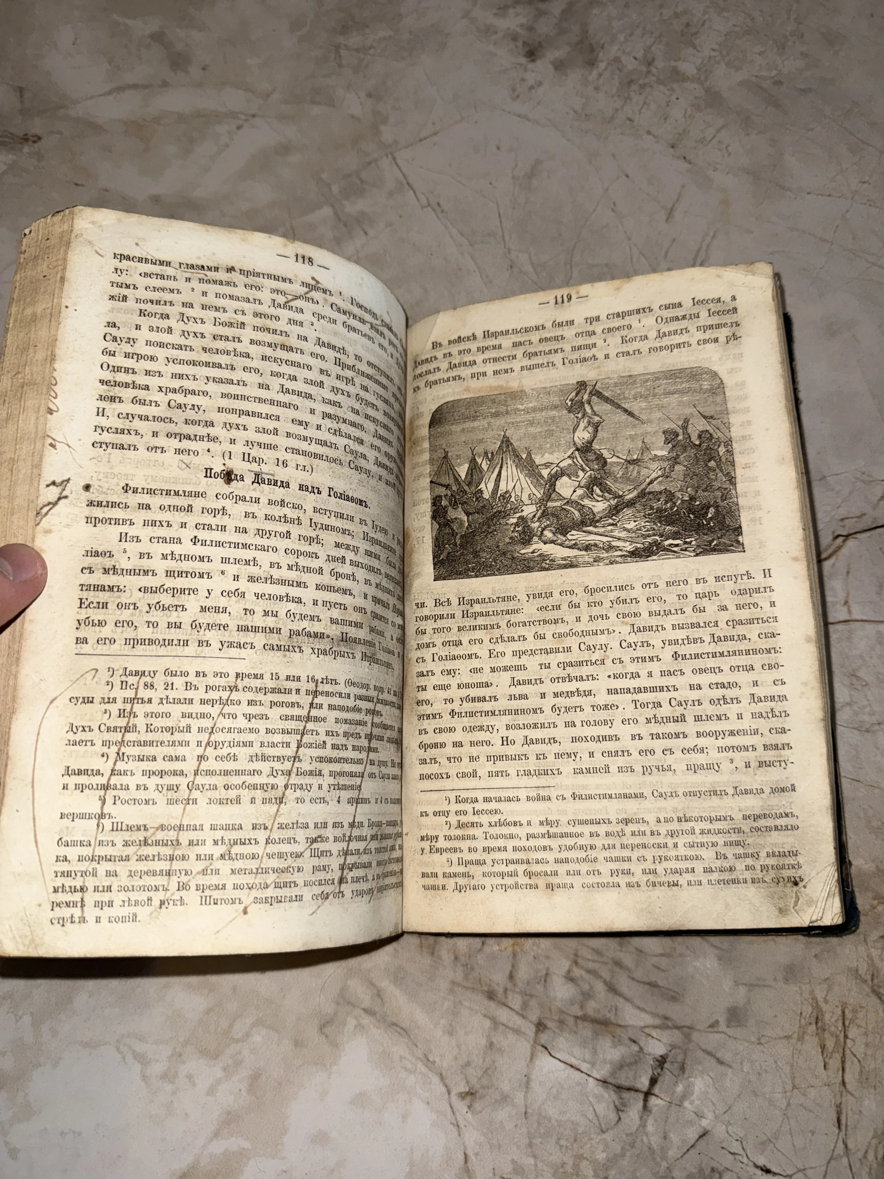 Разворот антикварной книги с дореволюционным шрифтом и гравюрой, изображающей битву Давида и Голиафа.