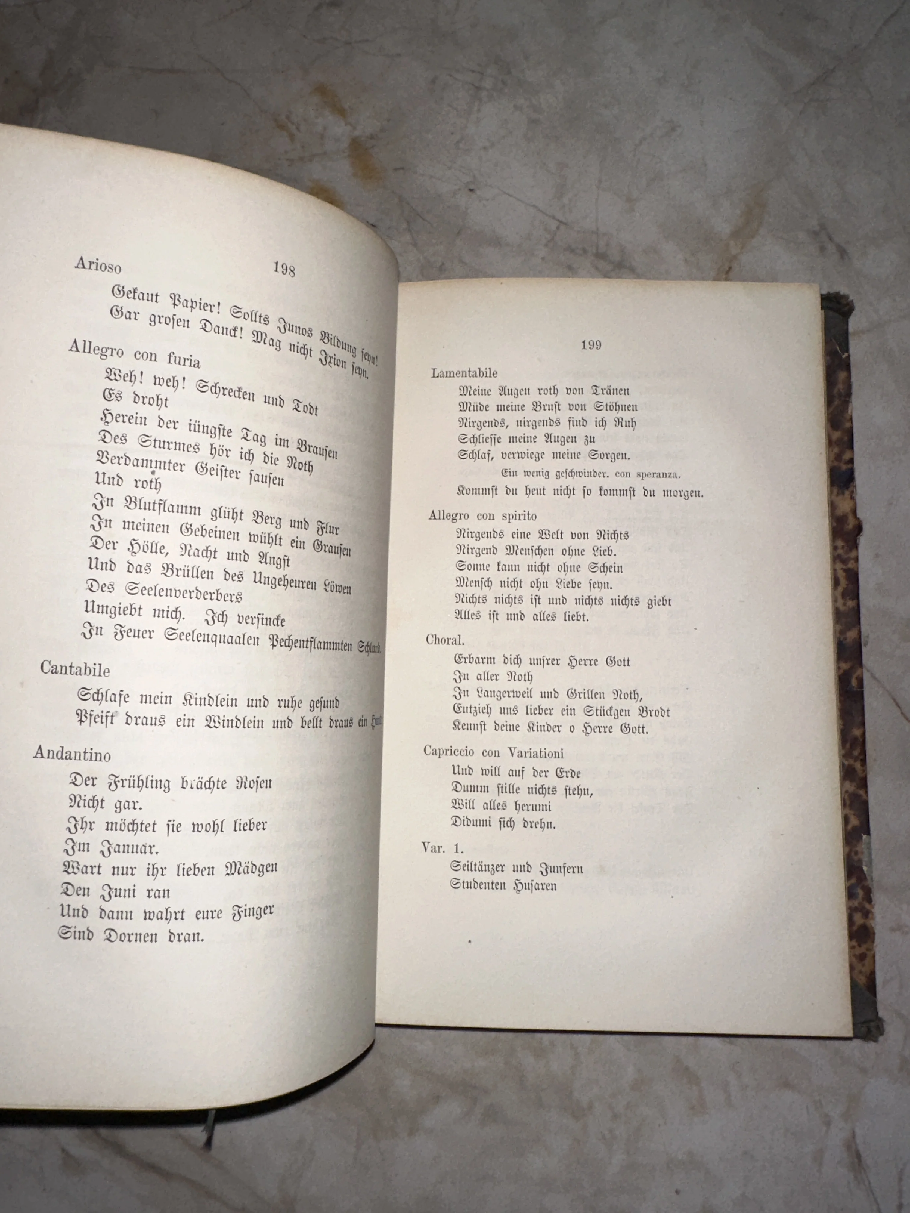 Этот редкий разворот старинной книги содержит тексты, структурированные музыкальными терминами, такими как Arioso и Allegro, напечатанные изящным готическим шрифтом. Благородное пожелтение бумаги и четкость типографики свидетельствуют о высоком качестве печати и бережном хранении. Издание станет ценным дополнением коллекции европейской литературы или уникальным реквизитом для ценителей эстетики прошлого.