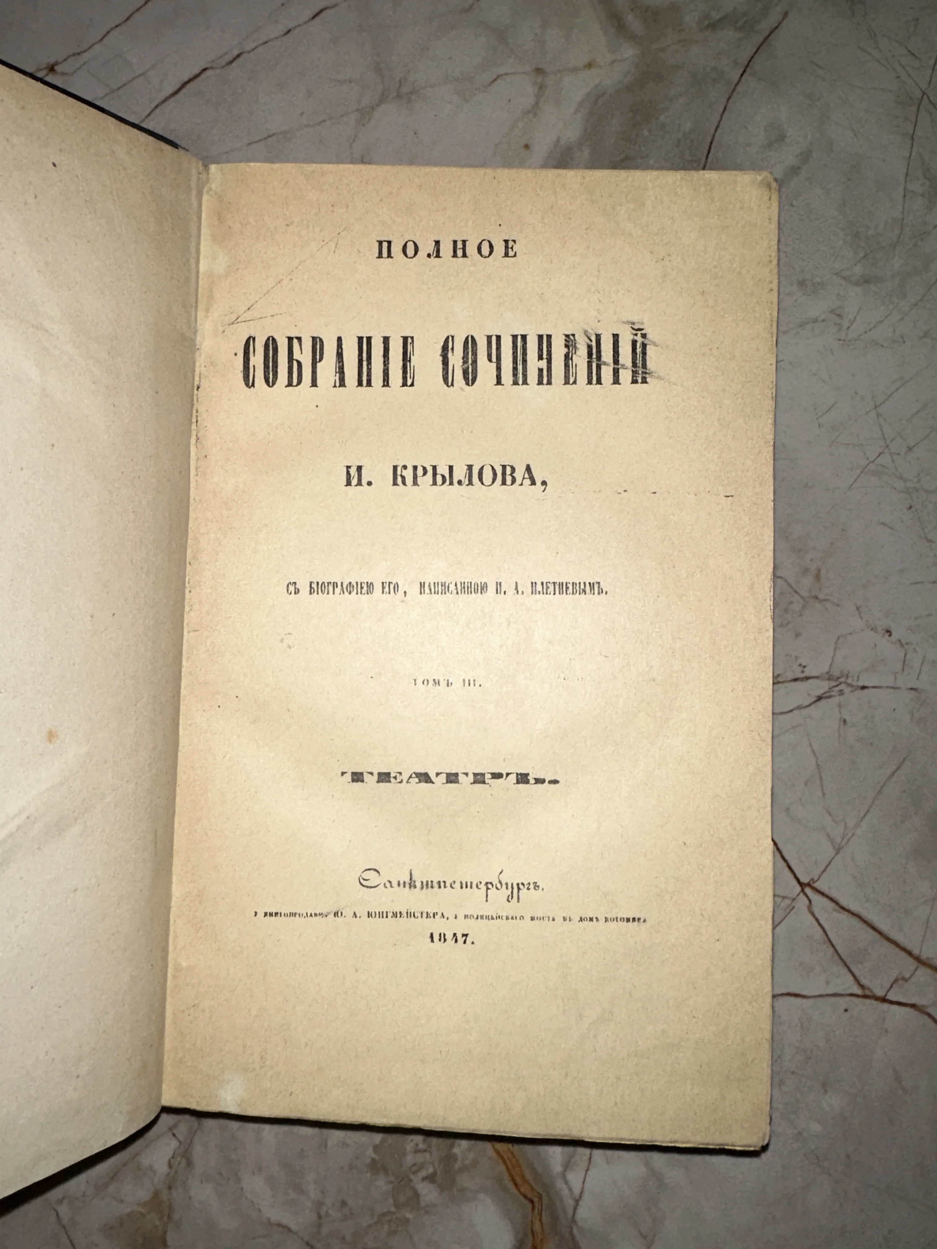 Титульный лист антикварной книги «Полное собрание сочинений И. Крылова», изданной в Санкт-Петербурге в 1847 году.