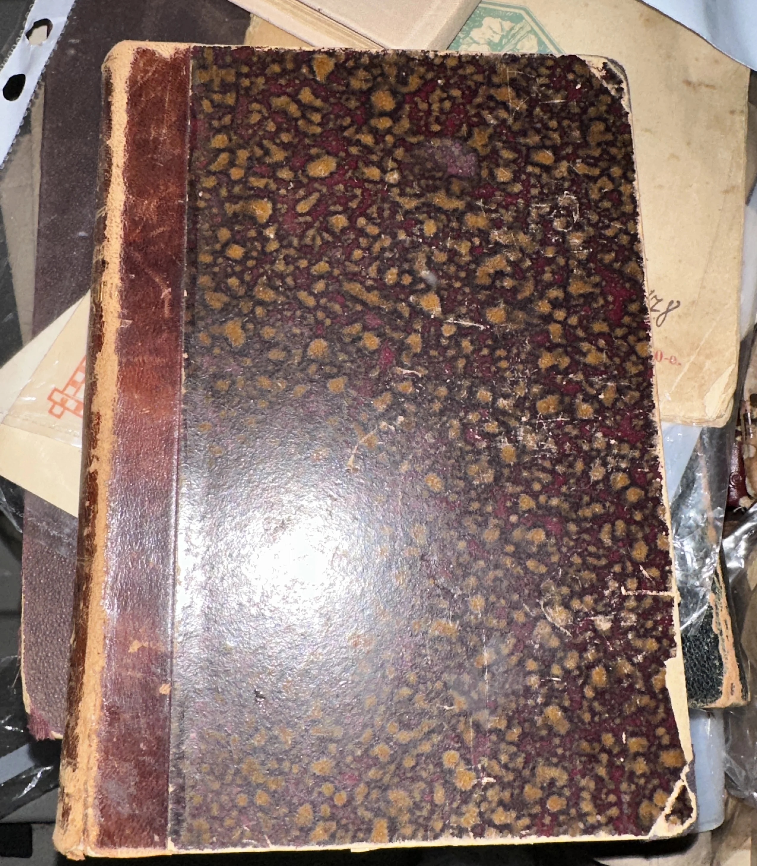Старинная книга с кожаным корешком и обложкой с пятнистым коричнево-бордовым узором «под мрамор»