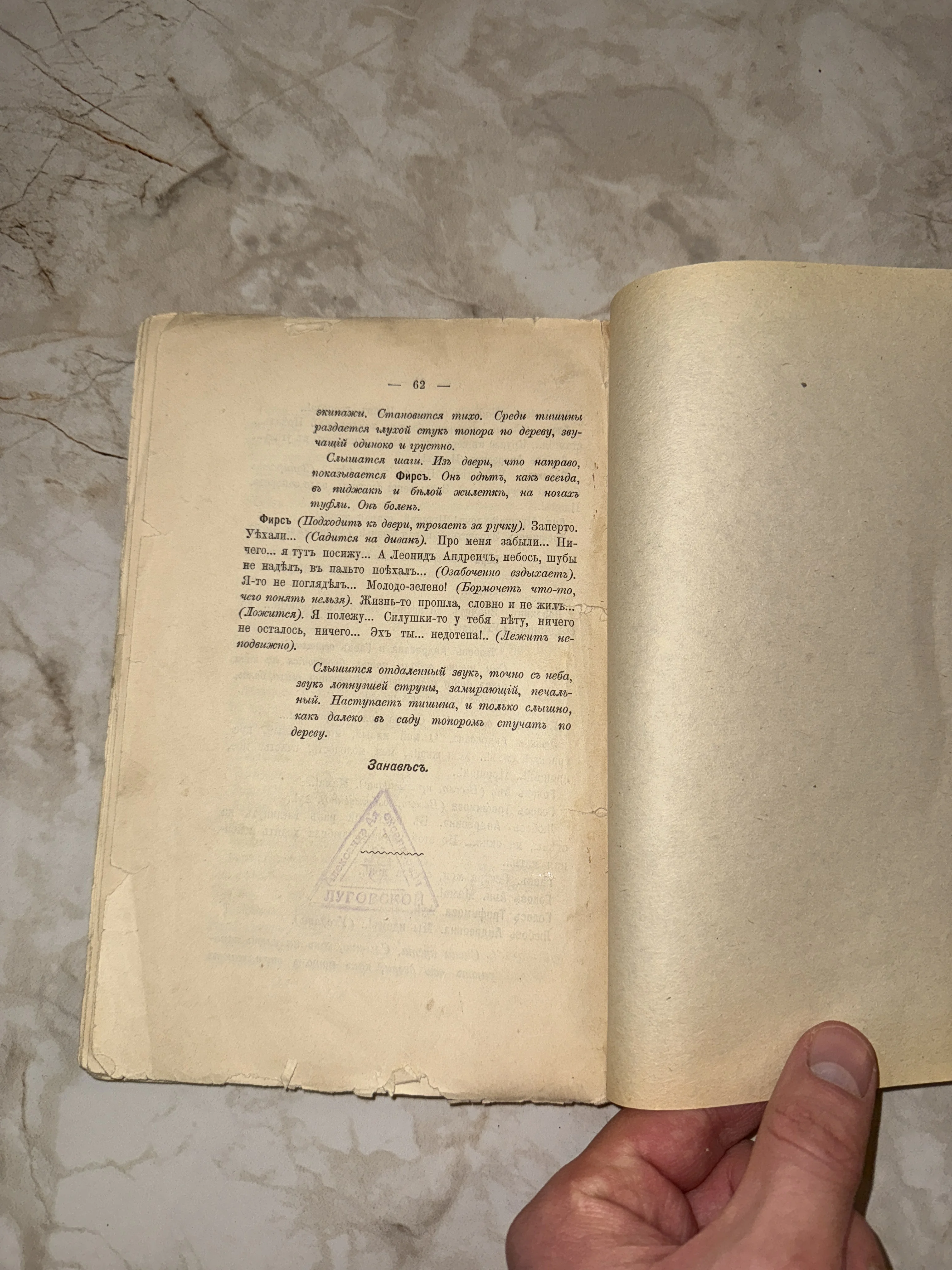 Уникальный экземпляр с финальным монологом Фирса, напечатанный в дореволюционной орфографии. Пожелтевшие от времени страницы с характерными замятыми краями и старинным штампом «Луговской библиотеки» передают неповторимый дух русской классики начала XX века. Этот предмет станет ценным дополнением коллекции для истинных ценителей театральной истории и библиофилов.