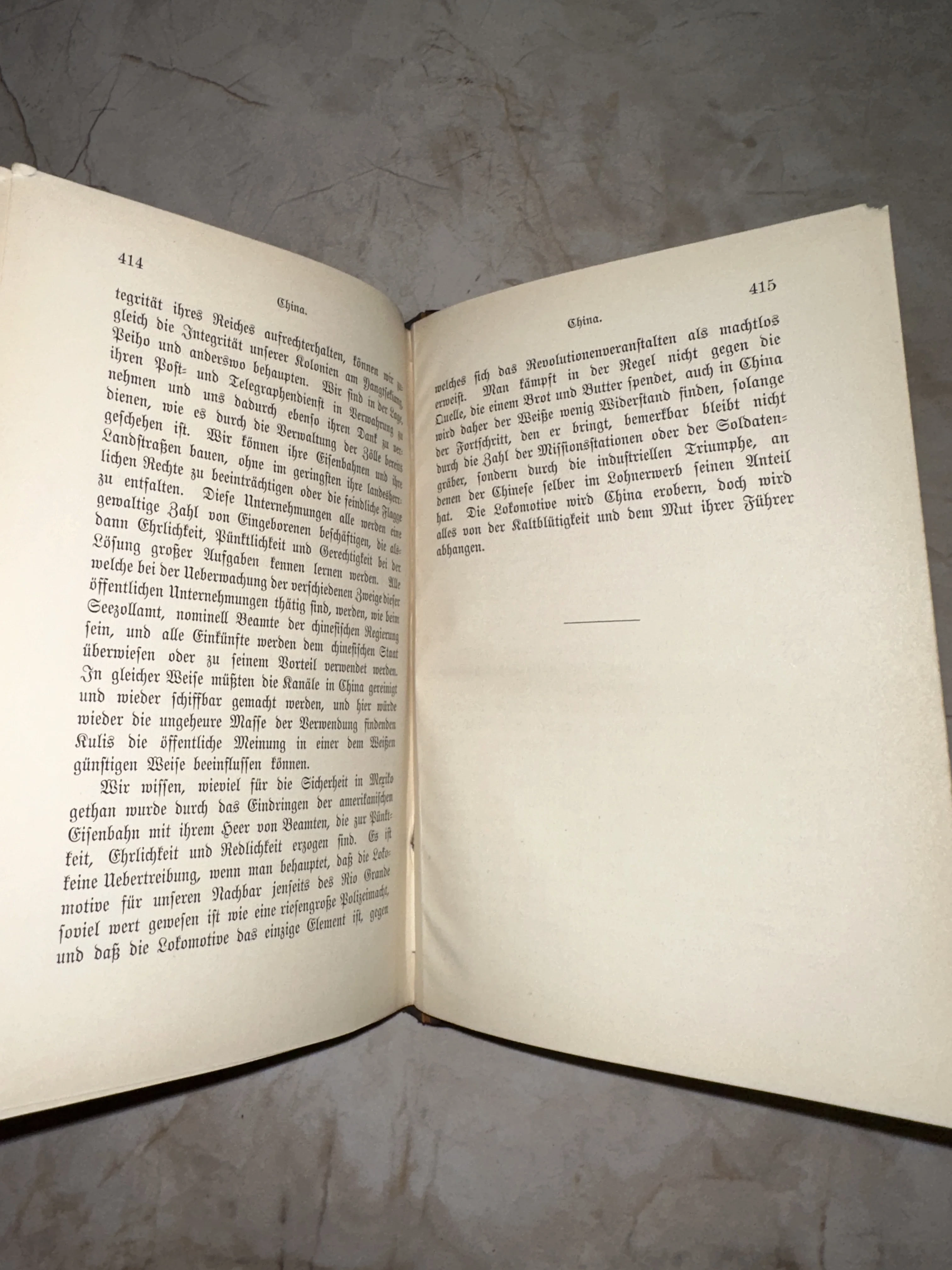 Разворот антикварной книги на немецком языке с готическим шрифтом, страницы 414 и 415, заголовок China.