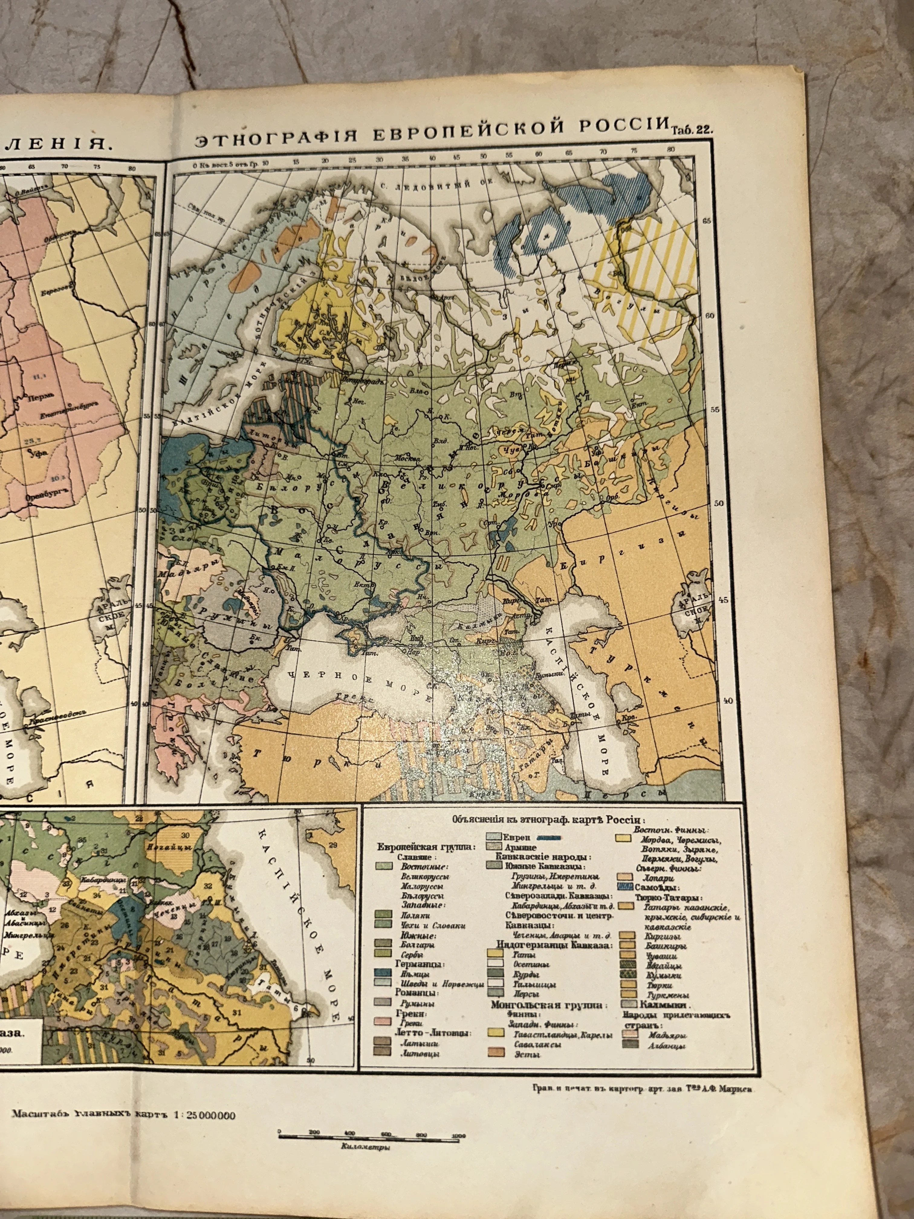 Этот редкий лист из дореволюционного атласа представляет собой детальный срез этнического многообразия Российской империи. Карта выполнена в технике цветной литографии с великолепно сохранившейся палитрой, где каждый оттенок обозначает уникальную группу народов. Идеальный образец для коллекционеров и историков, передающий дух масштабных географических исследований прошлого.