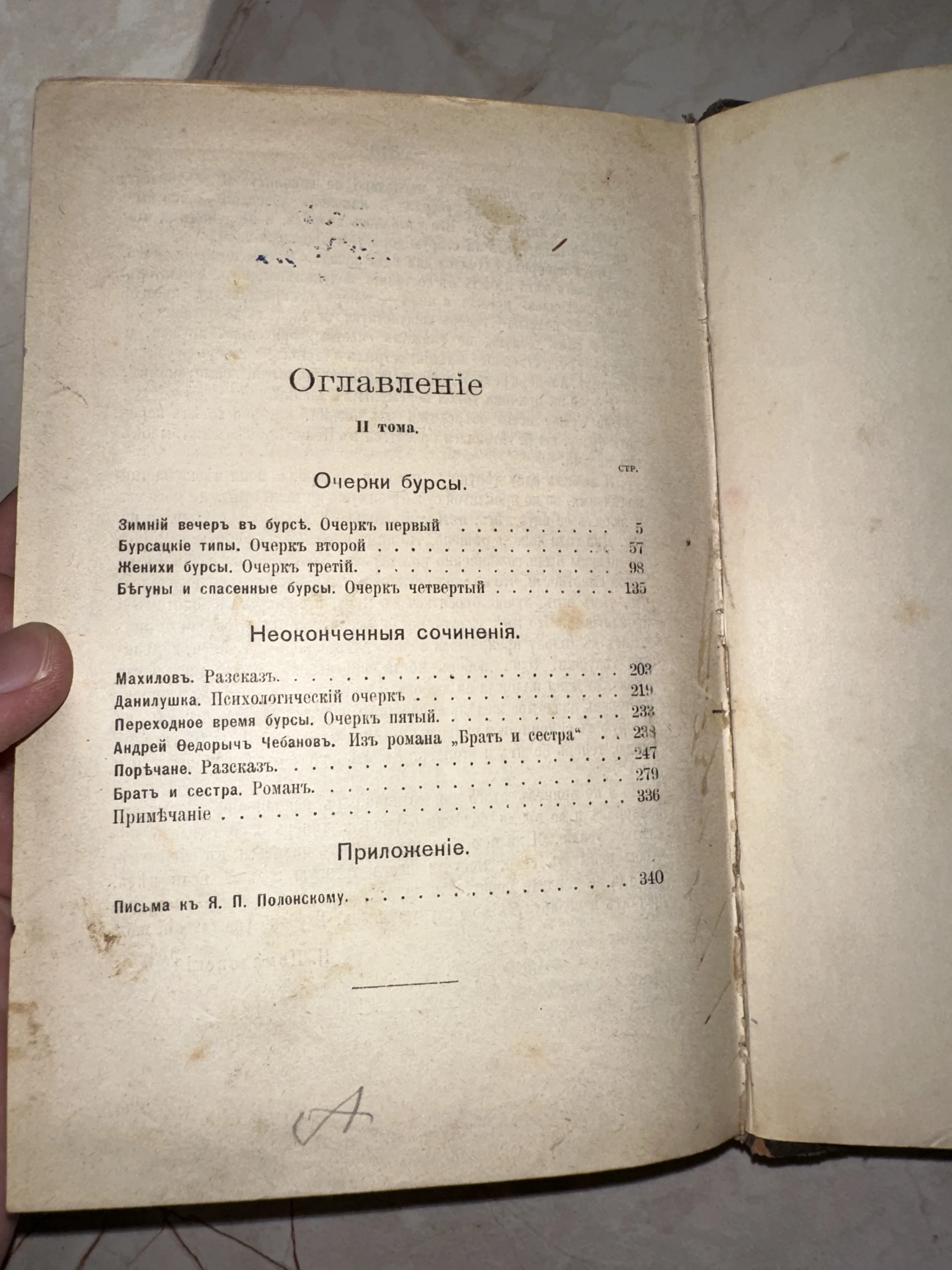 Эта страница оглавления открывает дверь в мир классической русской прозы, представляя знаменитые «Очерки бурсы» и неоконченные сочинения. Благородная патина времени на бумаге и аутентичный дореволюционный шрифт подчеркивают коллекционную ценность и историческую значимость данного издания.