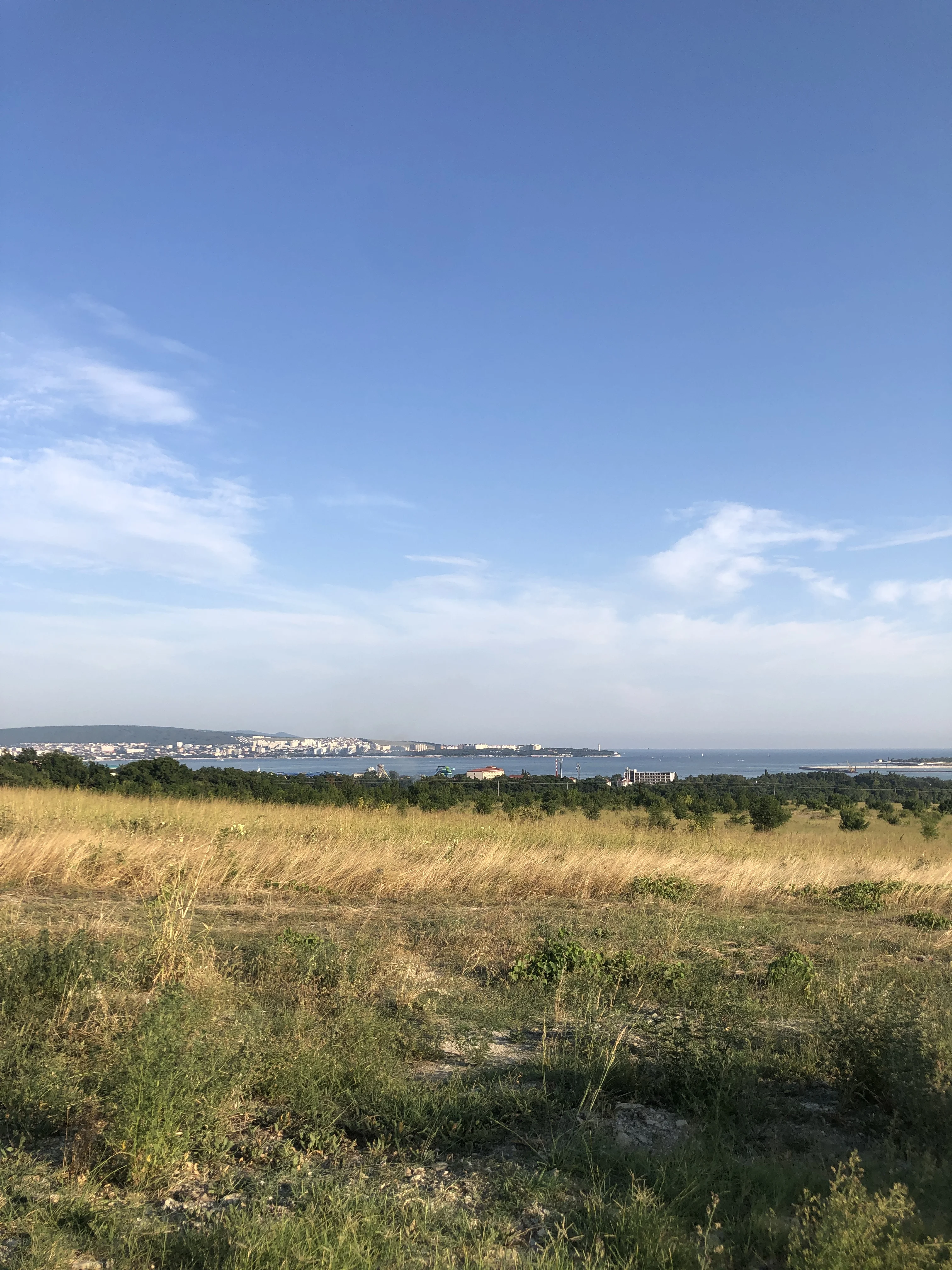 Живописный вид на побережье, где золотистое разнотравье встречается с лазурью моря и белизной прибрежной архитектуры. Фотография наполнена воздухом и светом, передавая умиротворяющую атмосферу теплого летнего дня на юге. Этот кадр станет прекрасным дополнением к коллекции видовых снимков, воспевающих красоту морских горизонтов.